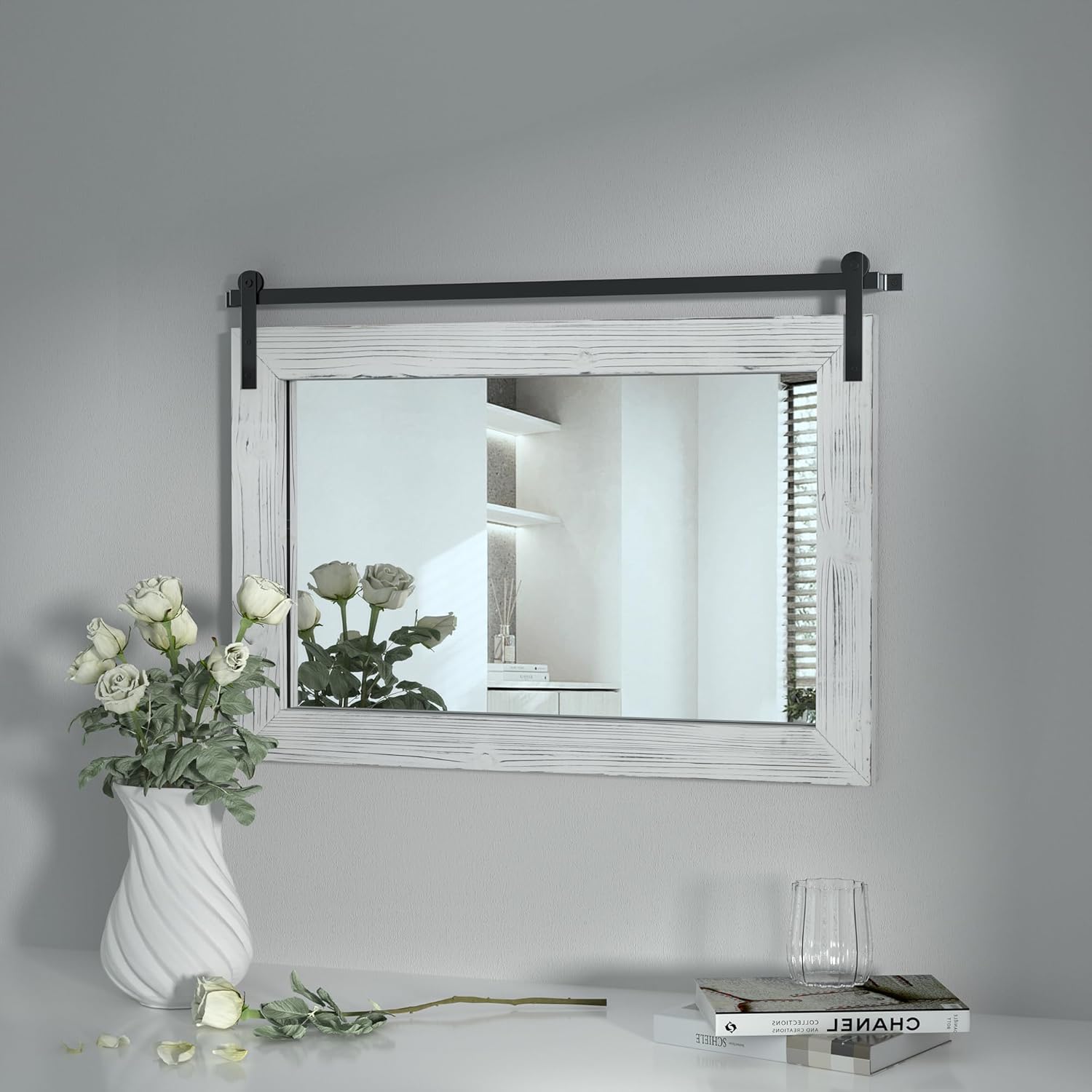 COGOOD Farmhouse Barn Door Mirror - 25 x 18 Rustic Wood Framed Decrative Mirror for Bathroom, Living Room, Entryway Wall Decor (White)