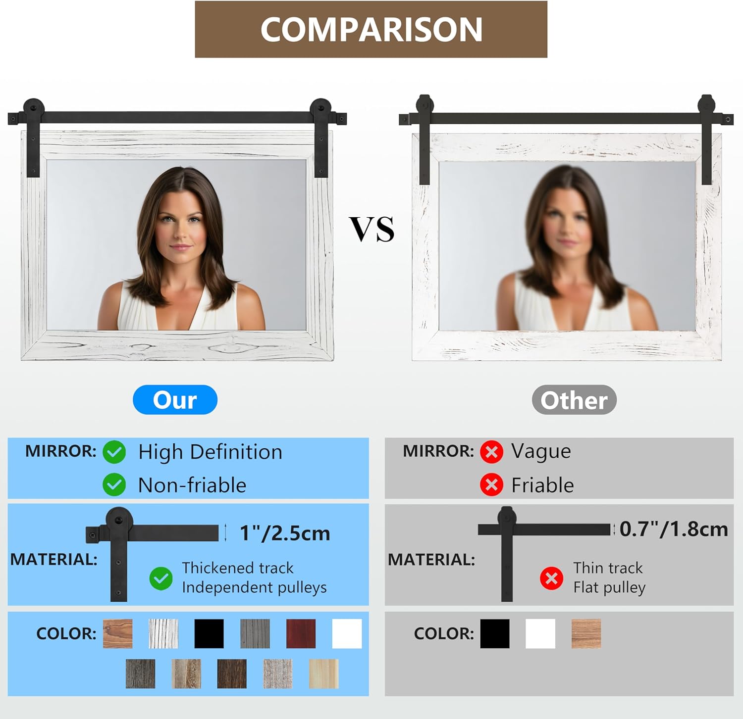 • QUALITY MATERIALS: The frame of the barn door mirror consists of an antique solid wood frame and a sturdy metal bracket. The interior features a 4mm HD silver mirror with clear and distortion-free reflections, providing a better sense of light and projection in your space