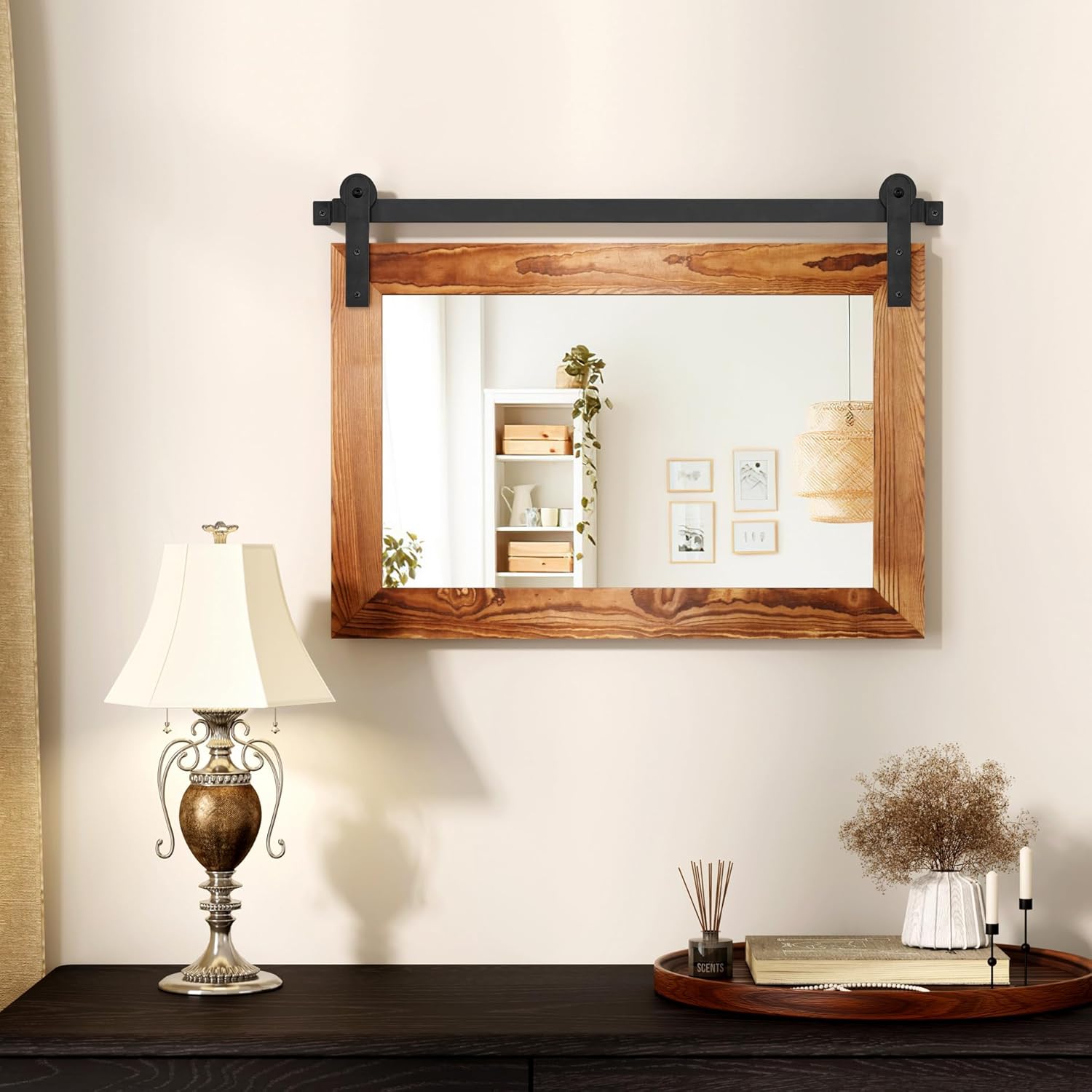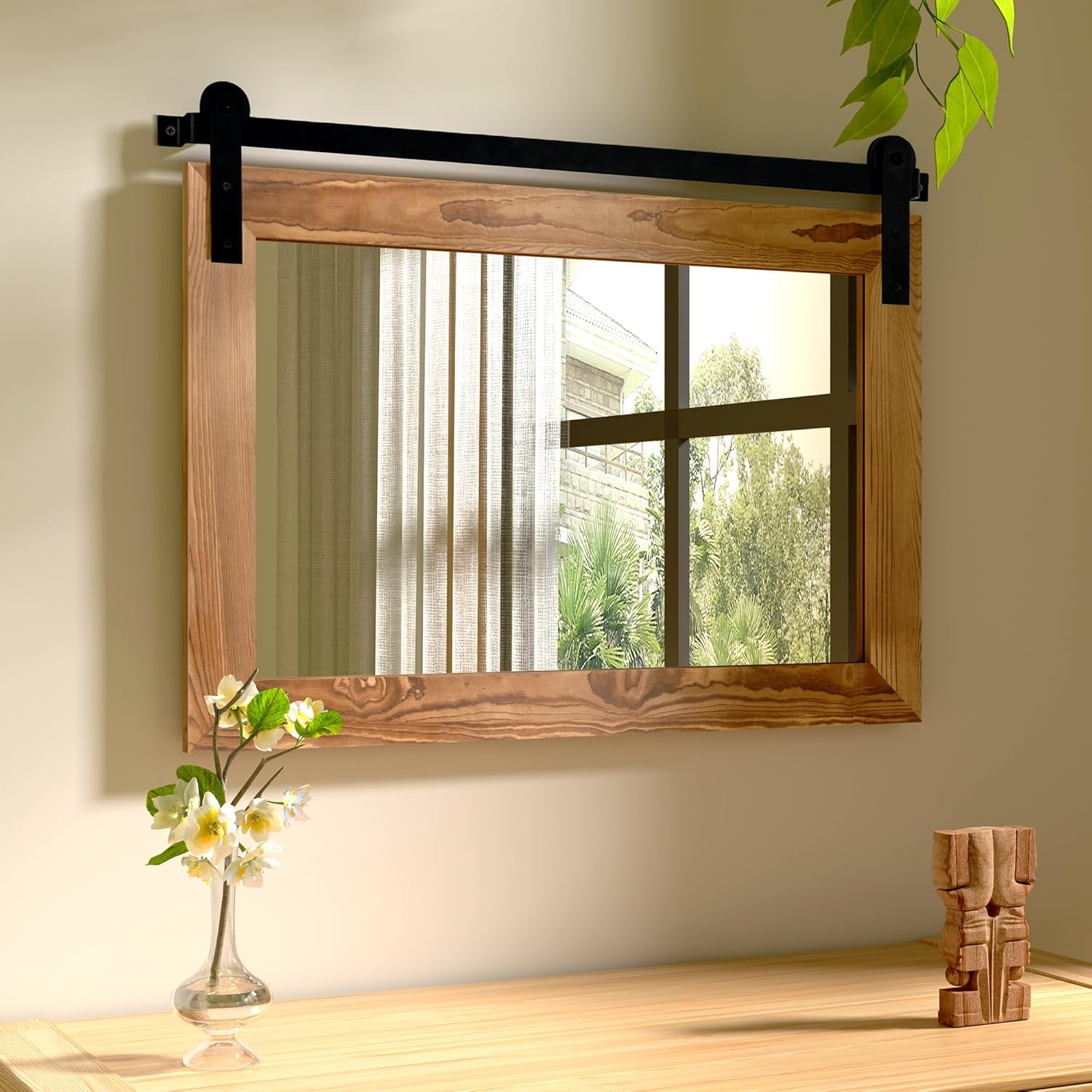COGOOD Farmhouse Barn Door Mirror - 25 X 18 Rustic Wood Framed Decrative Mirror for Bathroom, Living Room, Entryway Wall Decor (Brown)