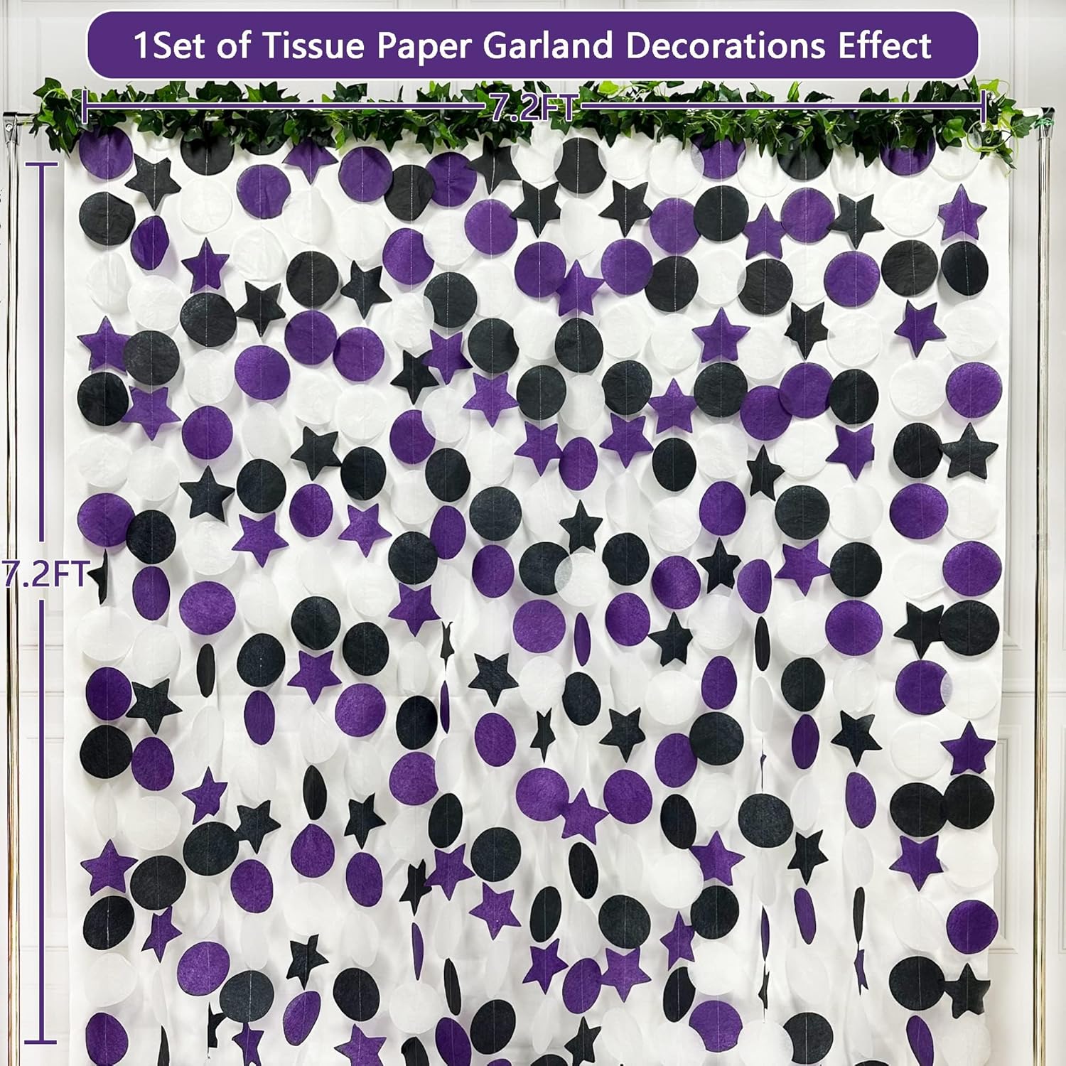 • โšซENVIRONMENTAL MATERIAL-Our purple black and white big circle dot star streamer garland are made of high quality tissue paper,carefully hand-made and machine-sewn together with thread.durable and reusable.Unroll & unwrap the tissue paper garland carefully. Due to delicate nature of thread, may tangle.