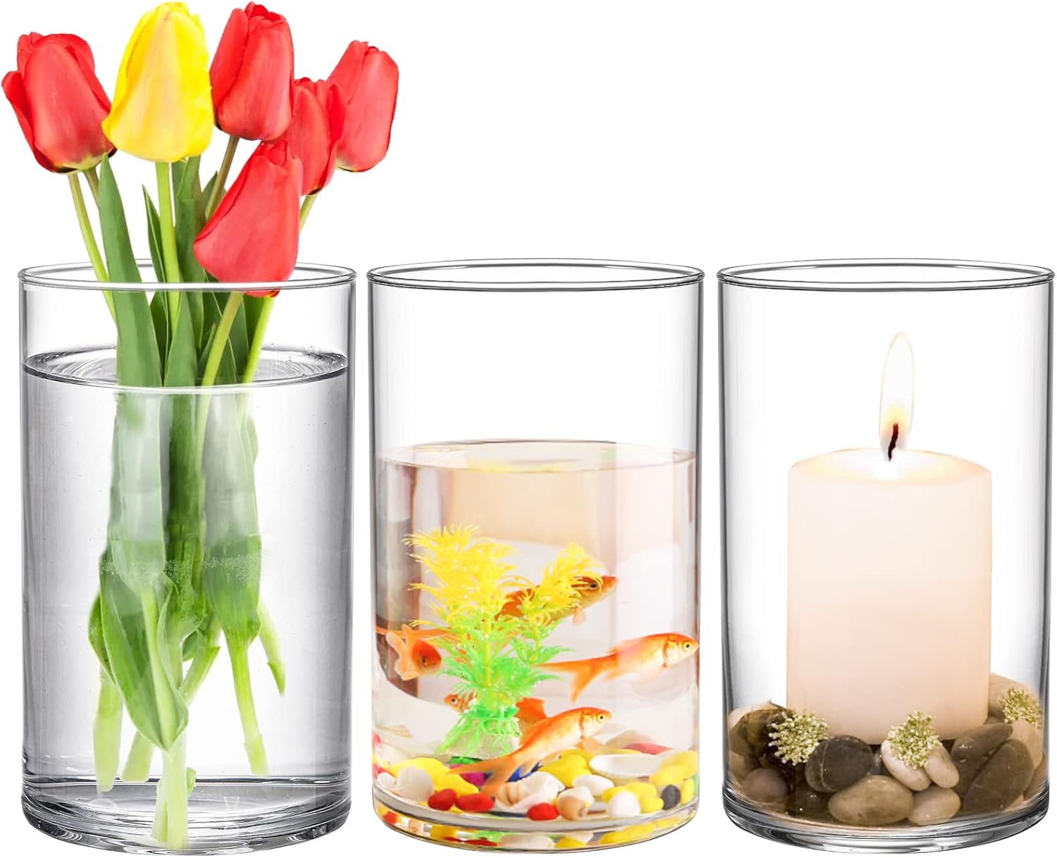 • Widely Used: These round glass vase can not only use as flowers vase decor, transparent cylindrical appearance can also be a pillar candles holder or floating candles holders and fish jar