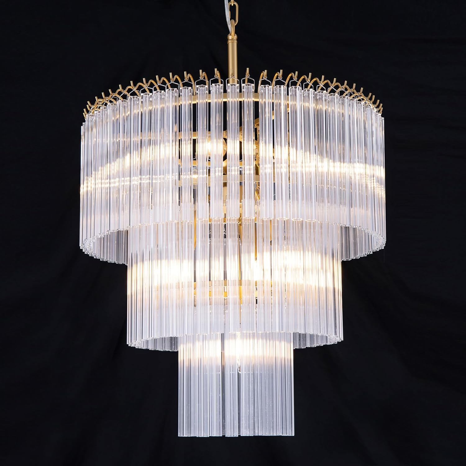 • Glass Tiered Chandelier: This chandelier is decorative with a classic line. The hand-textured glass cylinder cascade from the frame to radiate and refract light. The glass is intricately molded and shaped to form ornate cylinders that cascade in 3 tiers from the central frame