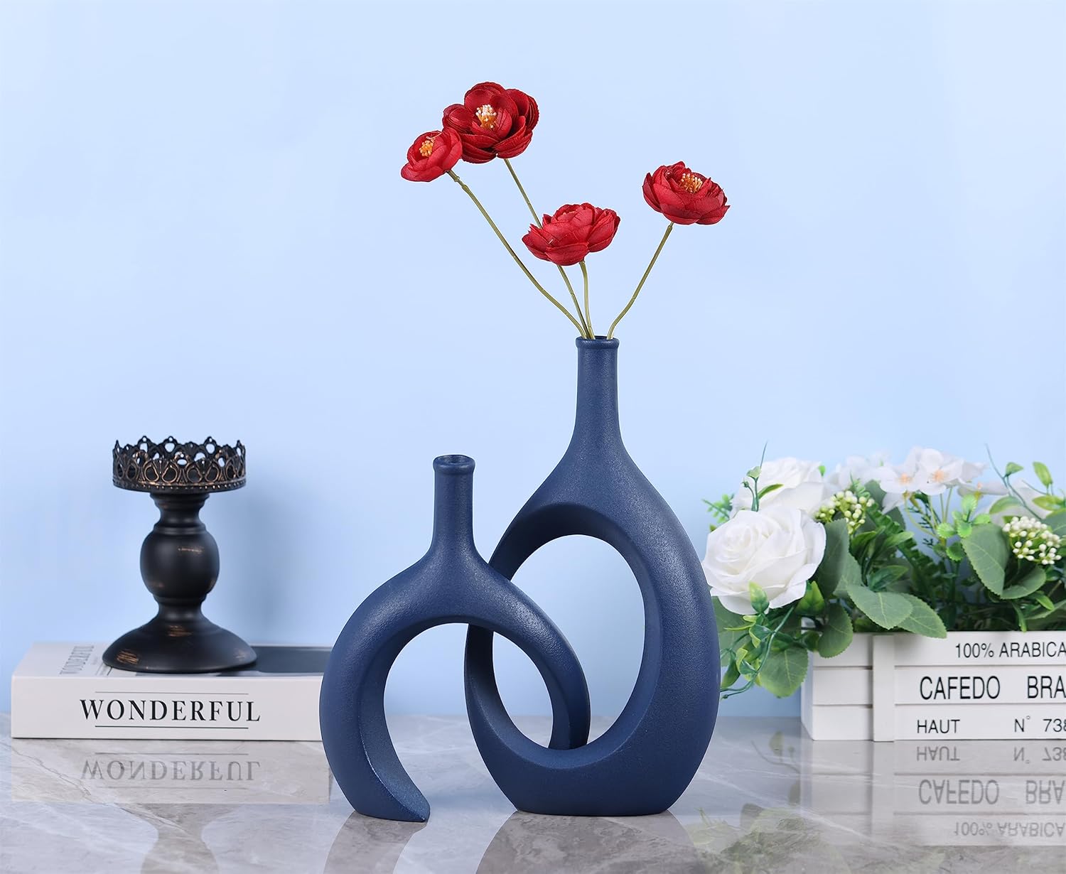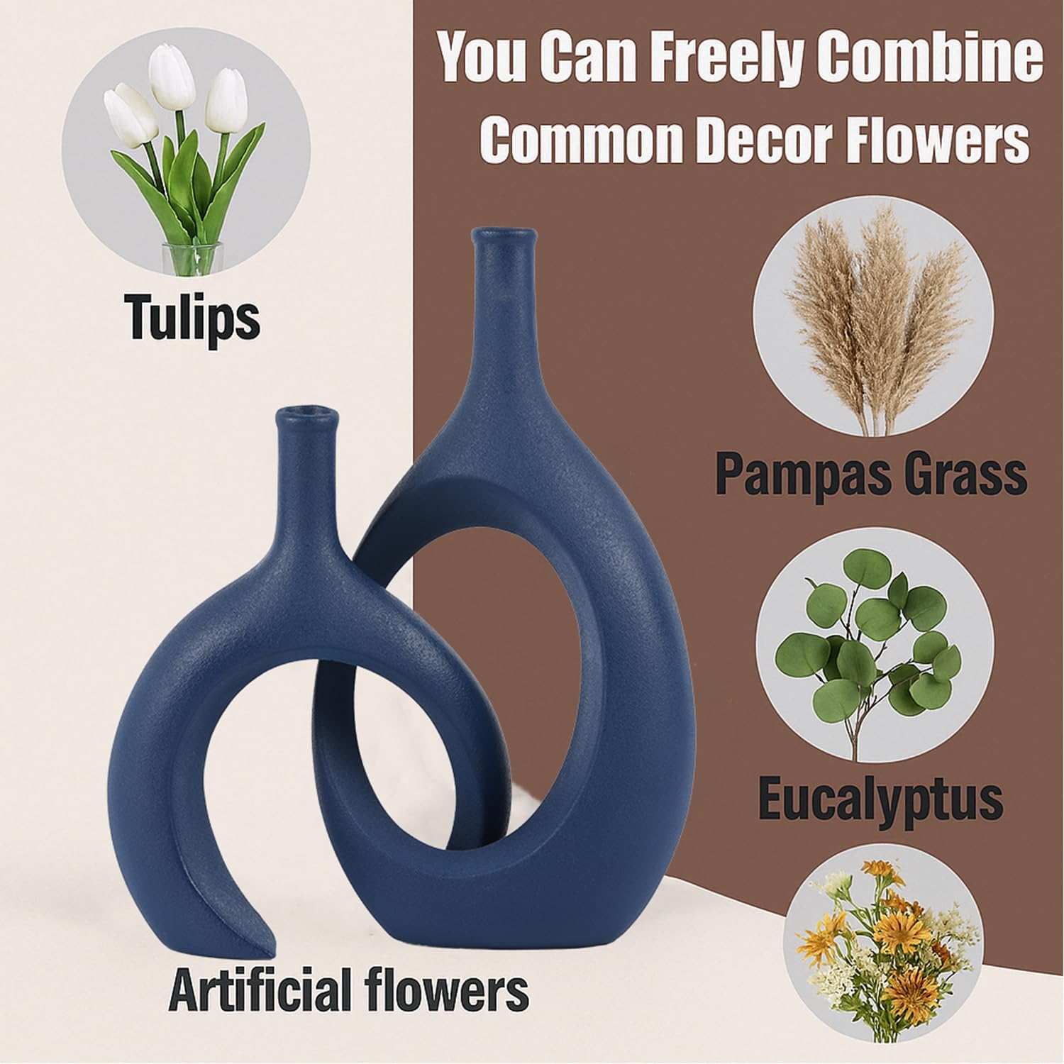 Blue Ceramic Vase Set of 2 - Modern Navy Blue Vase for Dining Table Centerpieces, Farmhouse and Home Decor, Office Partitions, Mantelpiece, Entrance Decoration