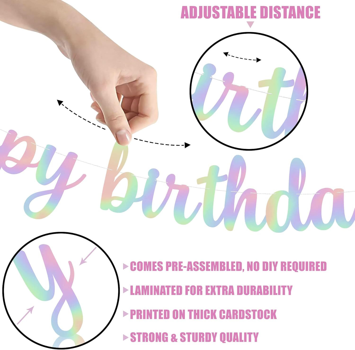 • Special Feature : Adjustable Letters, Iridescent Banner, Pre-Strung, No DIY, Shiny Large Banner, Sturdy and Reusable