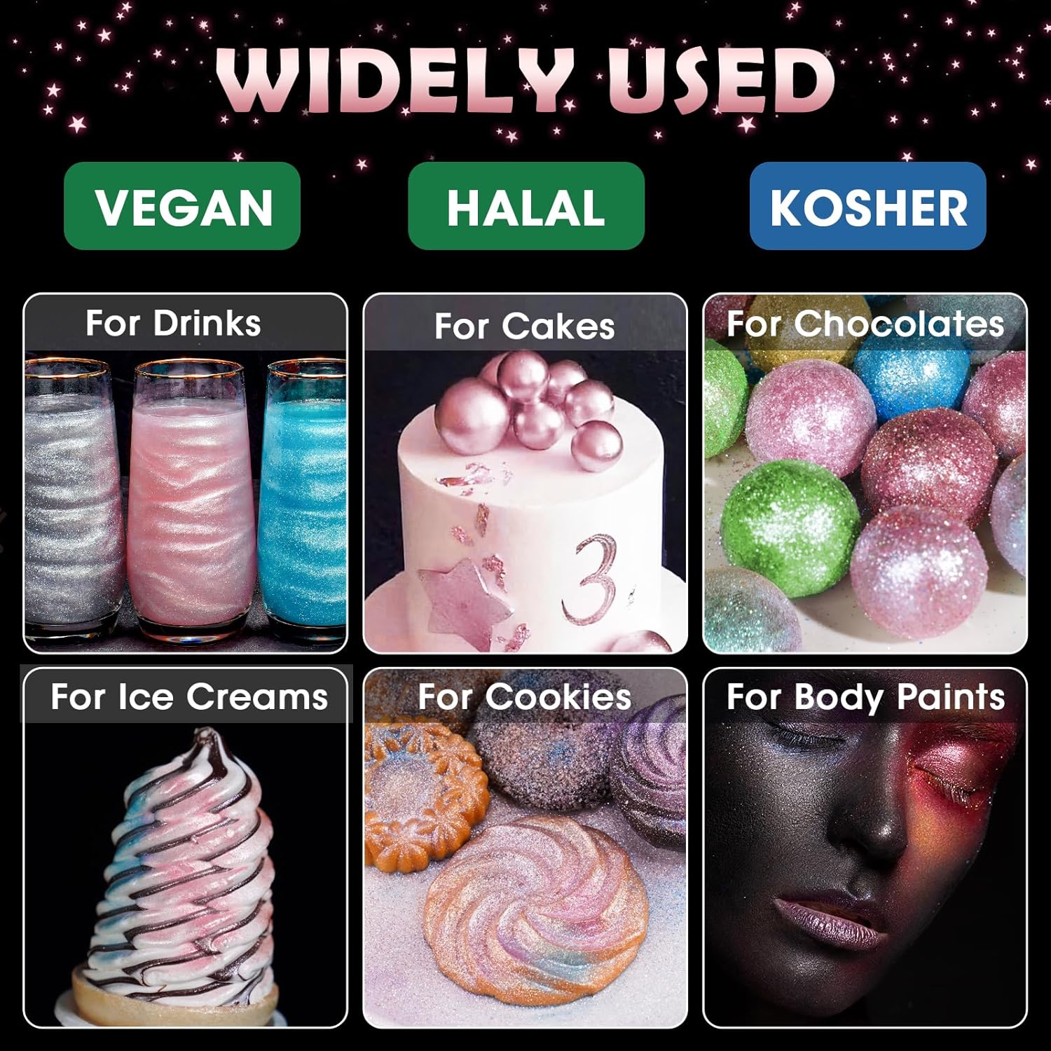 • ✔️【Vegan & Allergen-Free】Food-grade glitter uses only the highest quality vegan ingredients and does not contain common food allergens, including gluten, nuts or dairy products, so everyone can use and enjoy this product regardless of diet or food allergies. Unlike food contact glitter, these are 100% edible, so you don't need to worry about using them in your creations to make them sparkle for all.
