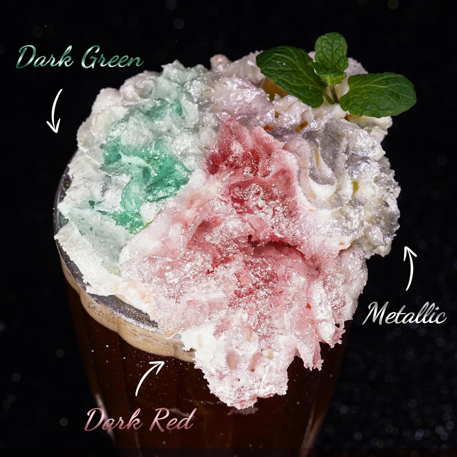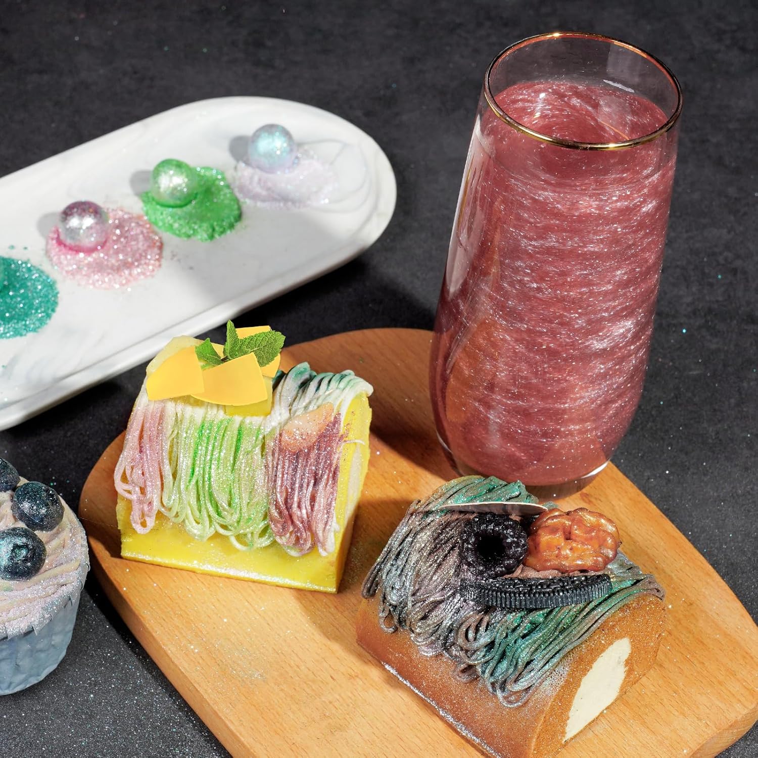 • ✔️【Easy to Use】Specially developed for food decoration and craft industries, this luster dust produces realistic looks by highly pigmented colors with a metallic finish. The pretty fine grain is more convenient for painting. To add glimmer and sparkle to your creations, simply sprinkle or dry brush the luster glitters on them. This product adheres very well to both wet and dry mediums. Attention: Seal and store glitter powder in a cool and dry place after use. Do not expose to excessive heat.
