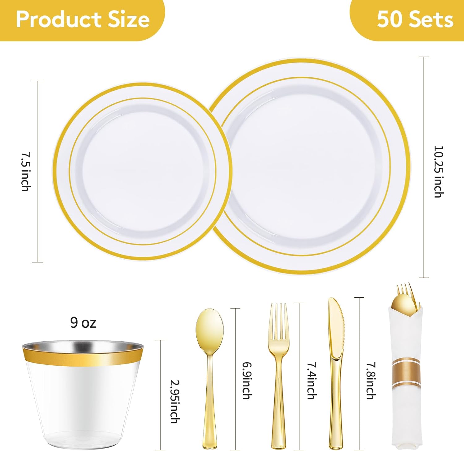 • WHAT YOU GET - 350Pcs gold party plates sets for 50 guests with 50 10.25" dinner plates, 50 7.5" salad plates, 50 Paper Napkins, 50 9oz cups, 50 knives, 50 forks, and 50 spoons.