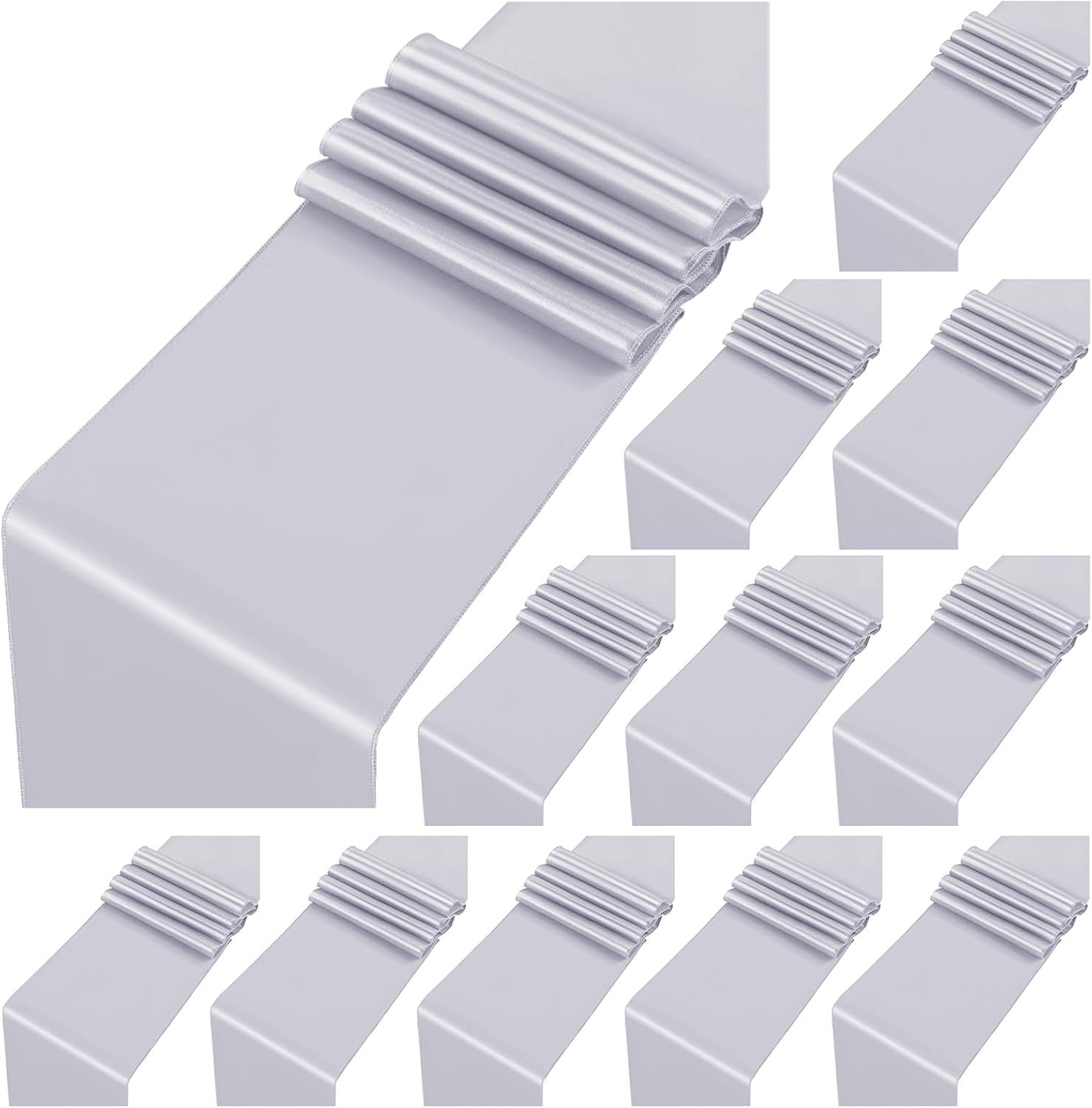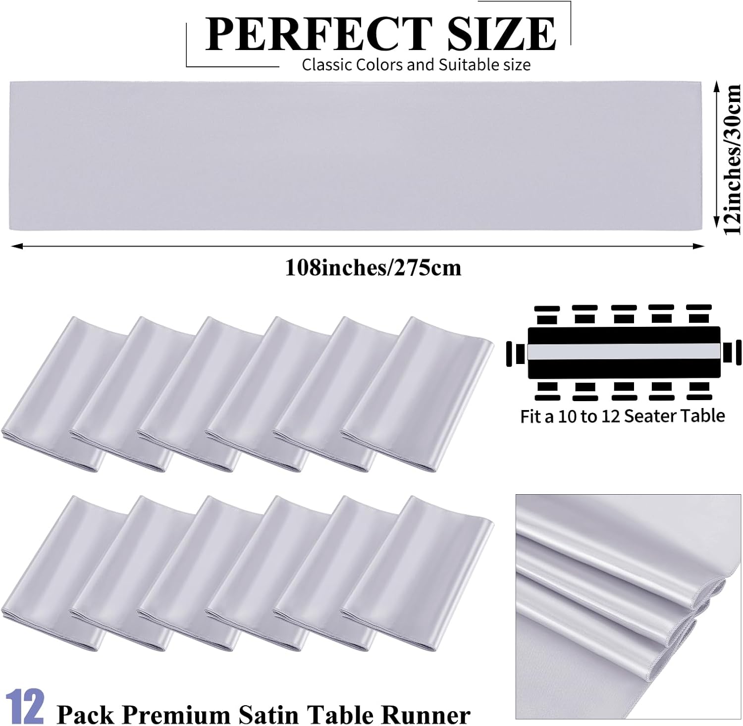 • 🥂【Set includes】12 Pack silver satin table runner measures 12" x 108" in size, appropriate for a table that can seat 8-10 people. This satin table runner can fit a 6ft/8ft rectangular table or round table well.This satin table runner is great for event table decorations.Our satin table runner make your dining table more dazzling and outstanding.Purchase our 12piece satin table runner and save even more.