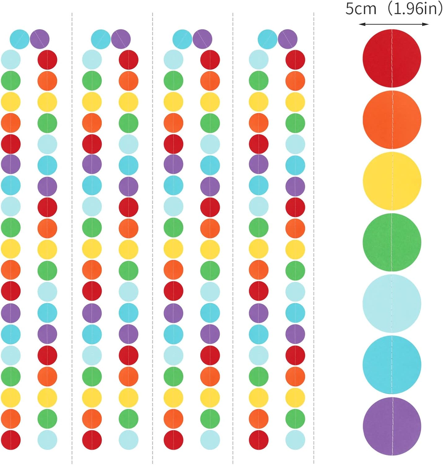 • 【Material】The material is eco-friendly colorful paper,red orange yellow green blue.You can cut to any length you want if you need shorter length.The dots are cut very neatly.