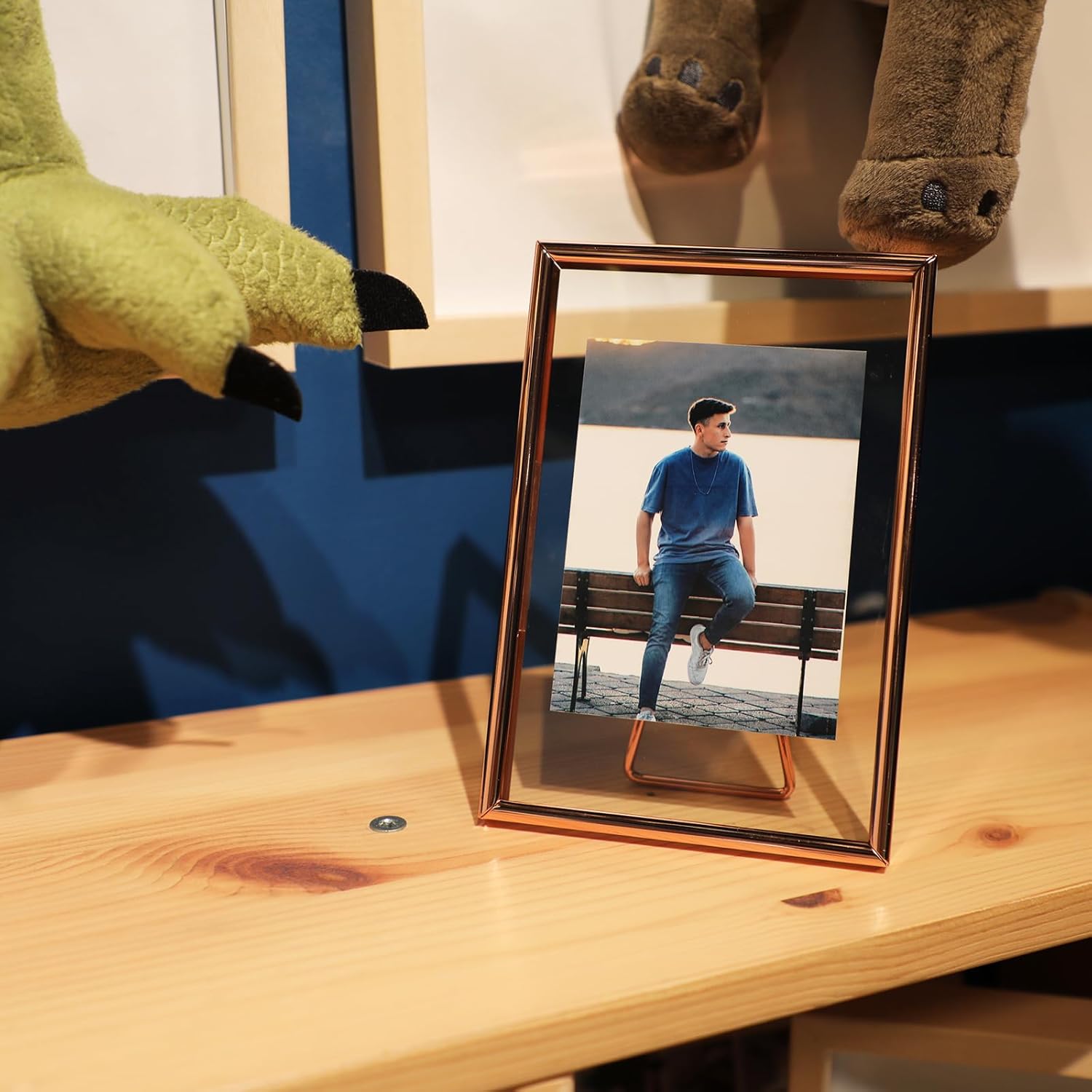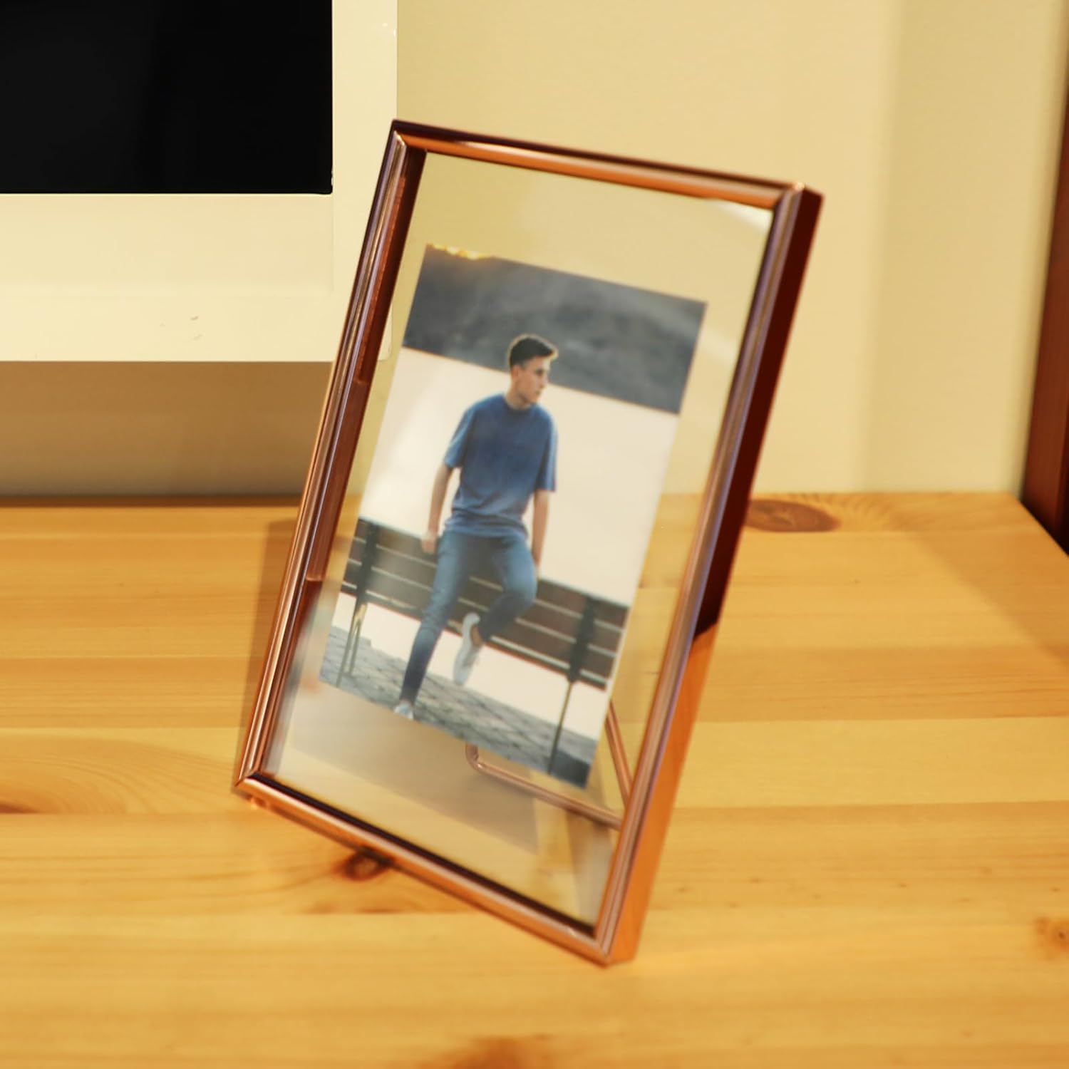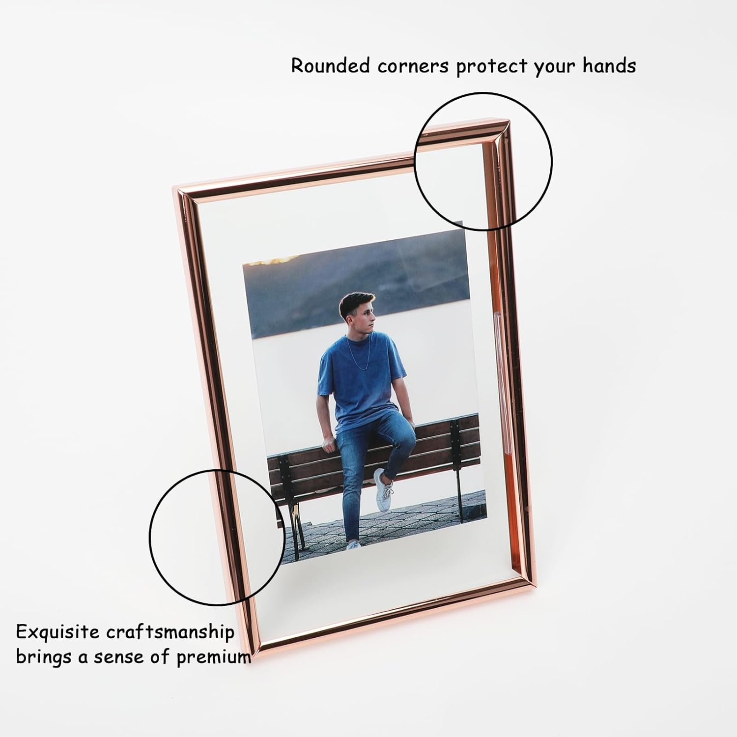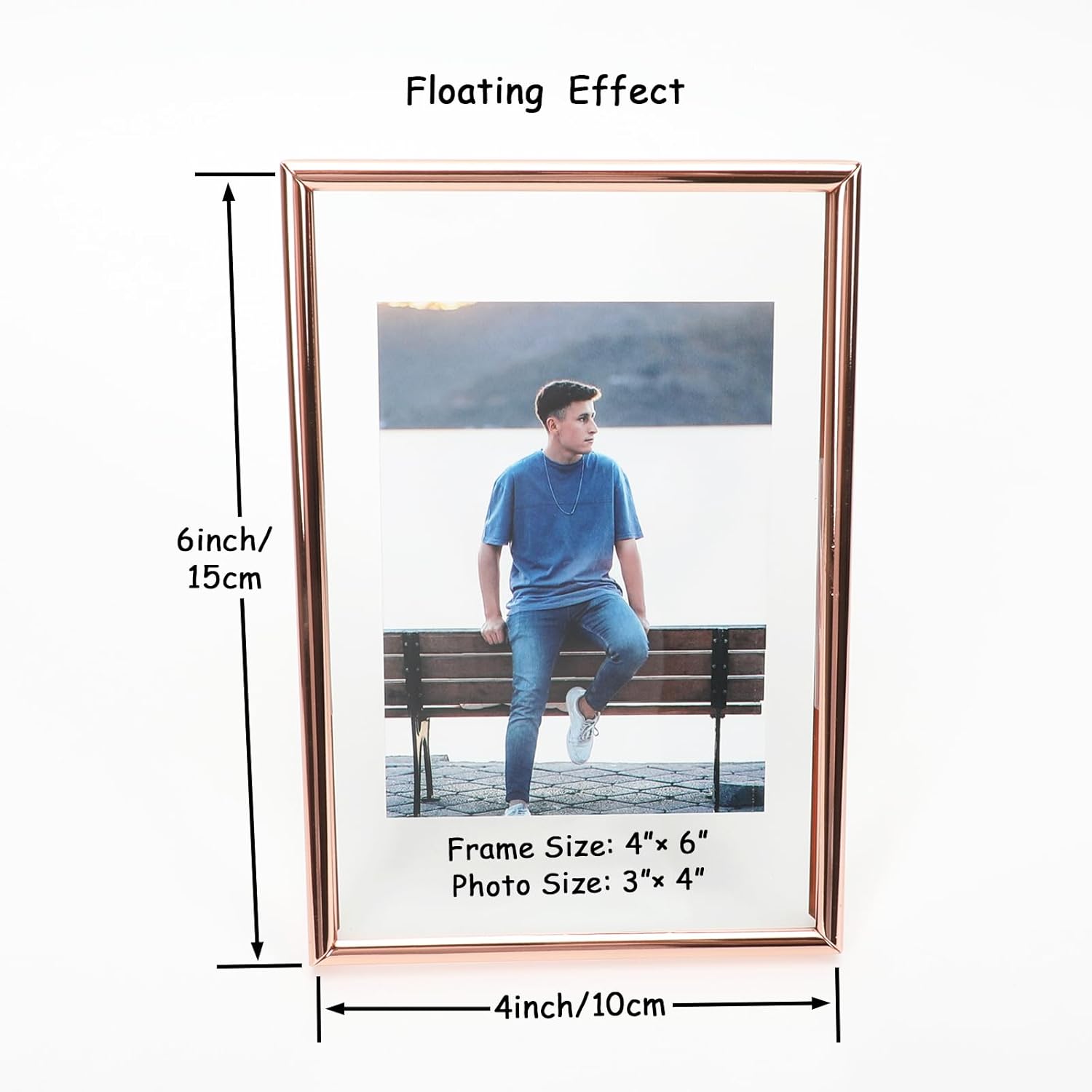 • 【Romantic Design】A rose gold metal frame with heart-shaped stand(Put you in my heart) and transparent glass, making it looks very romantic and elegant. It appears that the photo has a floating effect on it, So you can focus on the photo.