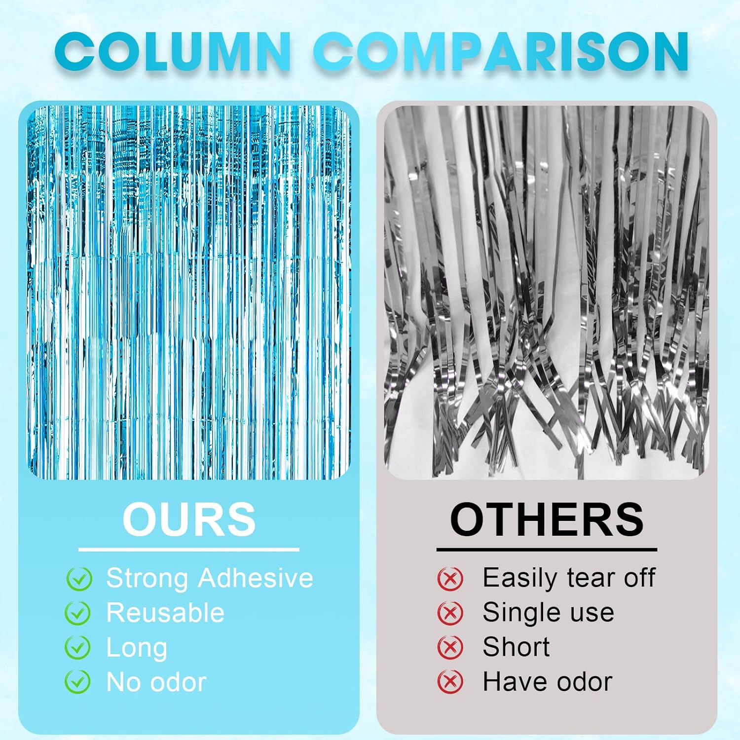 • Package Included: 3 packs of foil fringe curtains, the size of the foil curtain is 3.3*8.2 ft. It's long enough to fit any occasion. Please do not stick the foil curtain on uneven or stained walls to prevent it from falling off