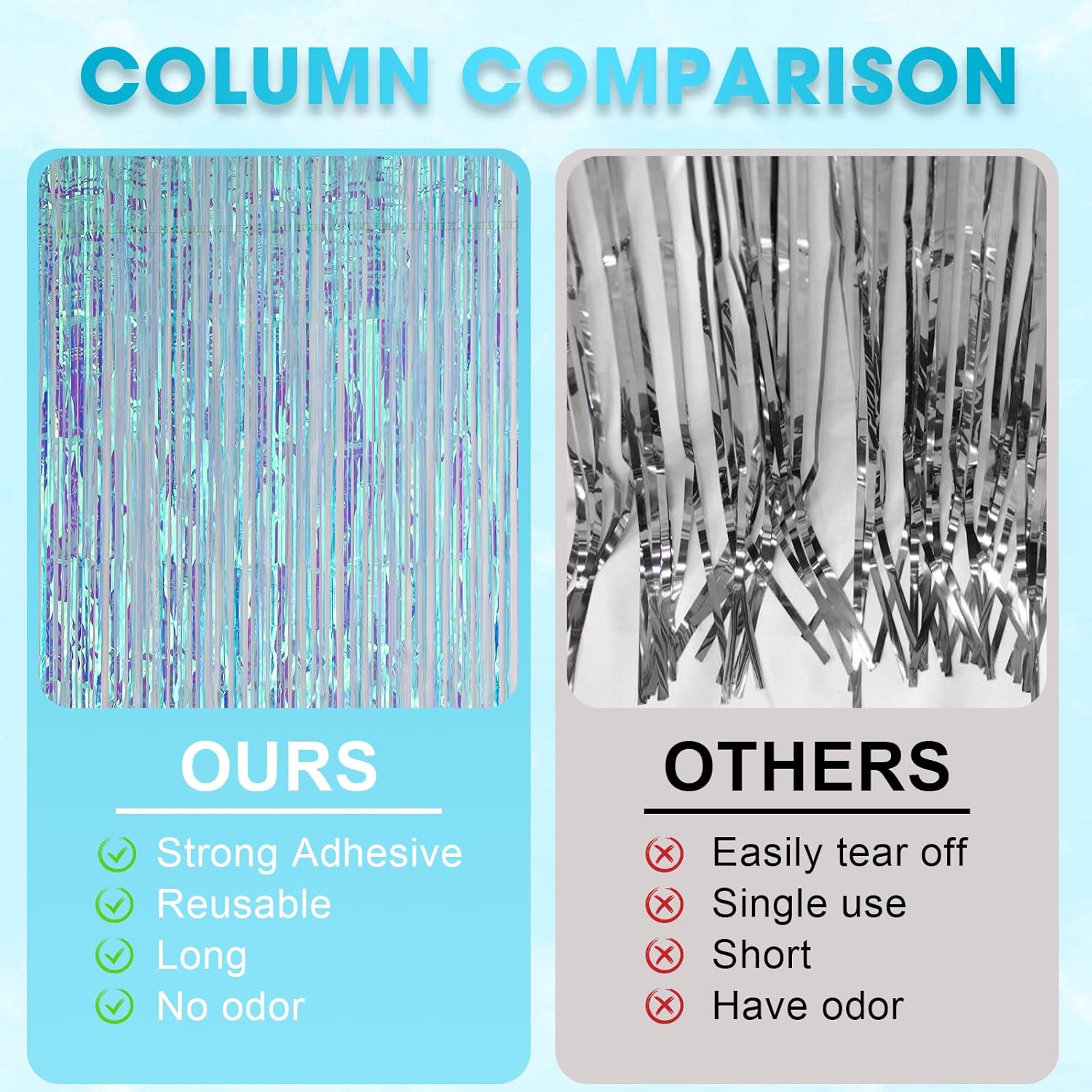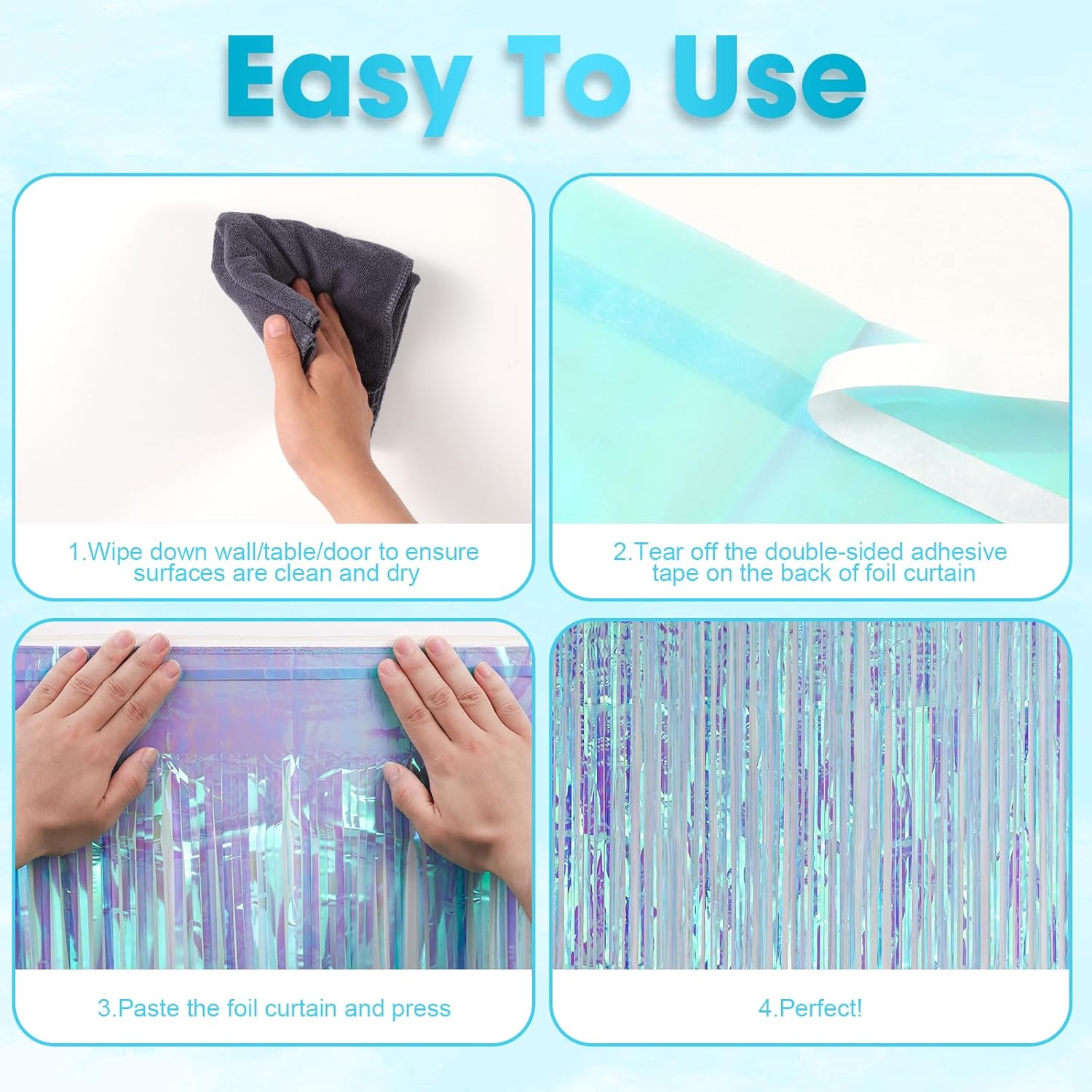 • Package Included: 3 packs of foil fringe curtains, the size of the foil curtain is 3.3*8.2 ft. It's long enough to fit any occasion. Please do not stick the foil curtain on uneven or stained walls to prevent it from falling off