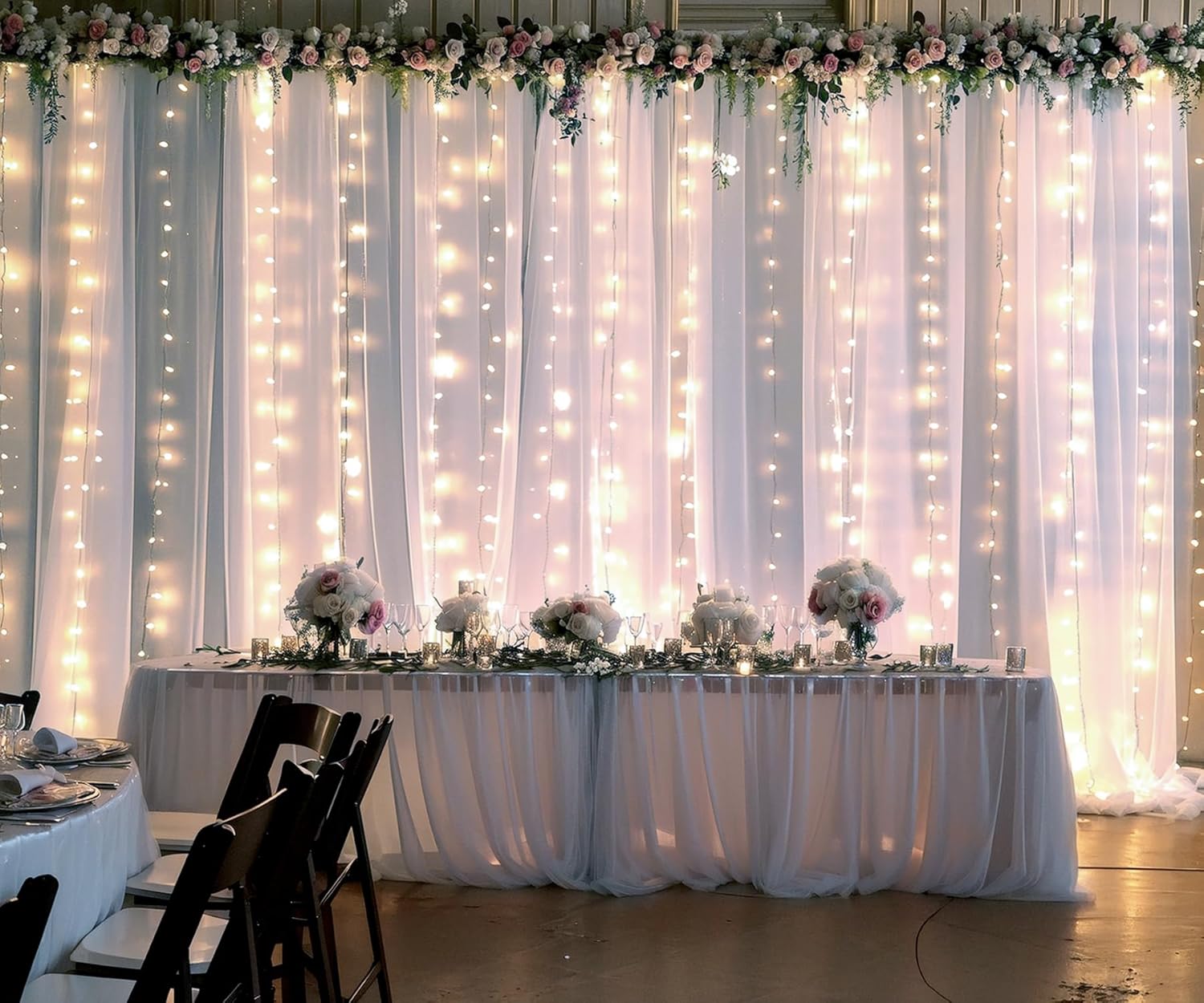 • Sheer backdrop curtains with lights wide range of use : Perfect for wedding backdrops for reception, wedding ceremony, photo booth, baby shower, birthday party, gender reveal, bridal shower, engagement, photography backdrop, photoshoot, graduation, room decorations, candy buffets, dessert tables background, Christmas decorations or anywhere you want.