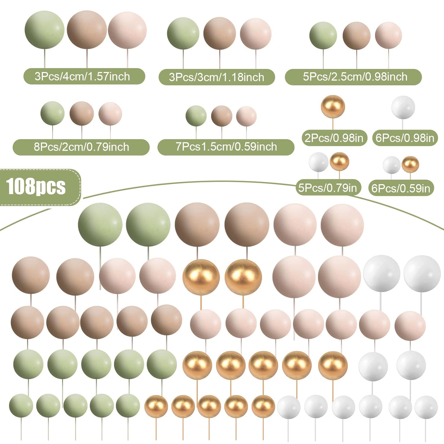 108 Pcs Balls Cake Topper DIY Cupcake Insert Foam Balloons for Cake Baking Wedding Anniversary Birthday Decoration(Matcha Green, Light Brown, Khaki,Multi Sizes)