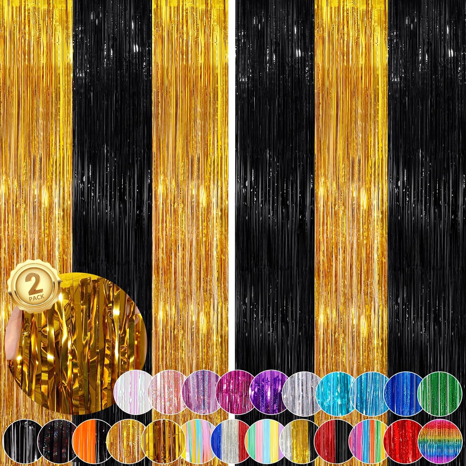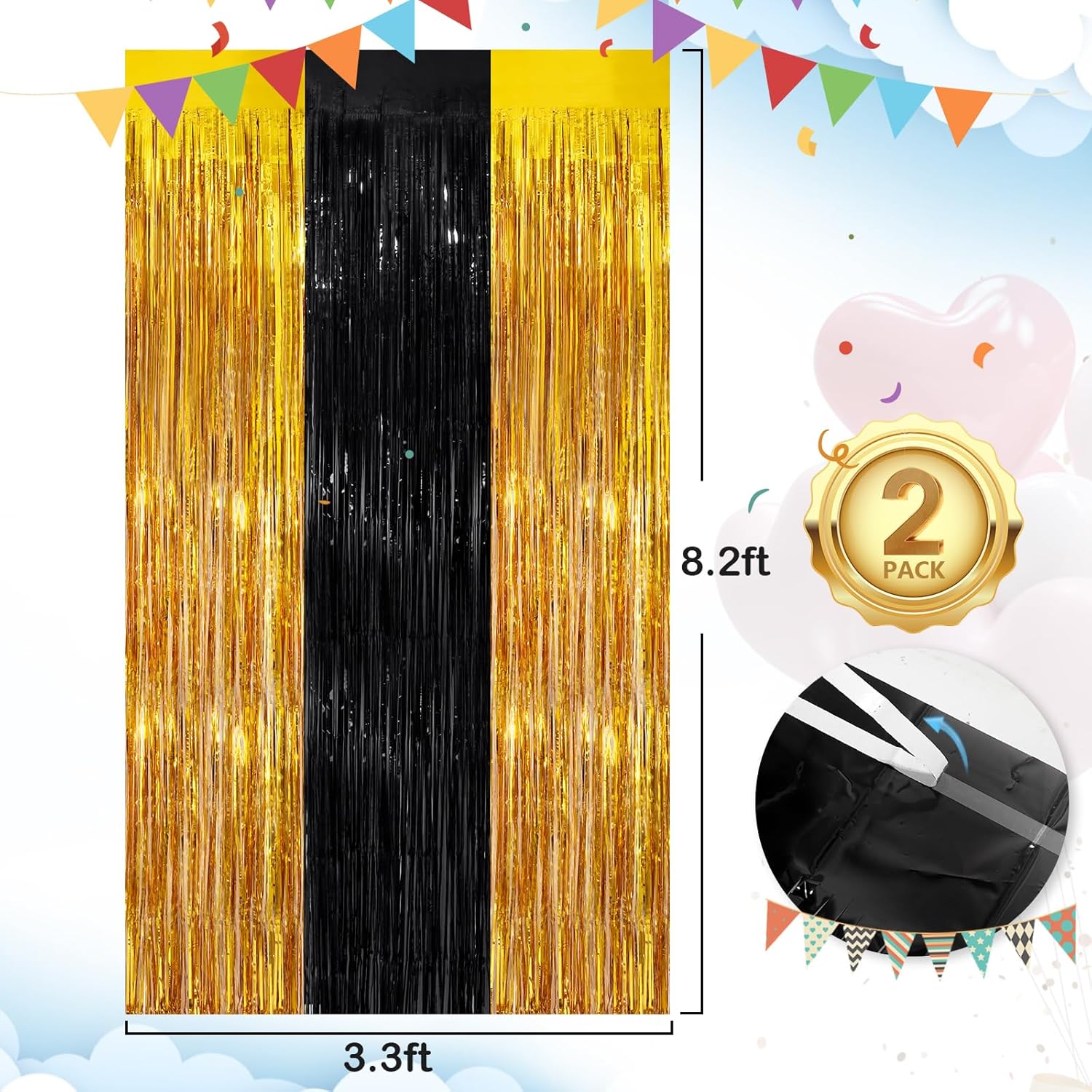 Black Gold Streamer Tinsel Foil Fringe Curtains Streamer 2Pack 3.3X 8.3Ft Streamer Tinsel Streamer Curtains for Birthday Party Decors Wedding Bachelorette Bridal Shower Xmas Decors Streamers