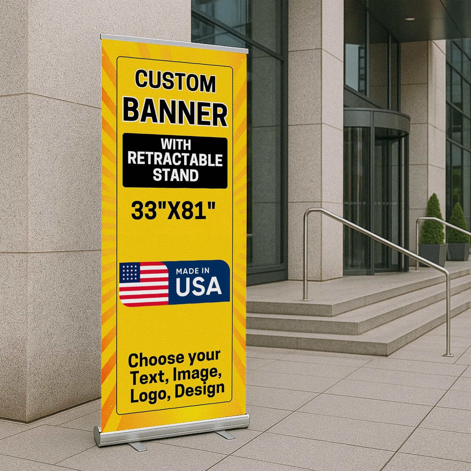• Made in the USA: Our retractable banners include a customizable high-resolution graphic banner and a durable roll-up stand. Need assistance with design, ordering, or installation? Our in-house design team is here to help!