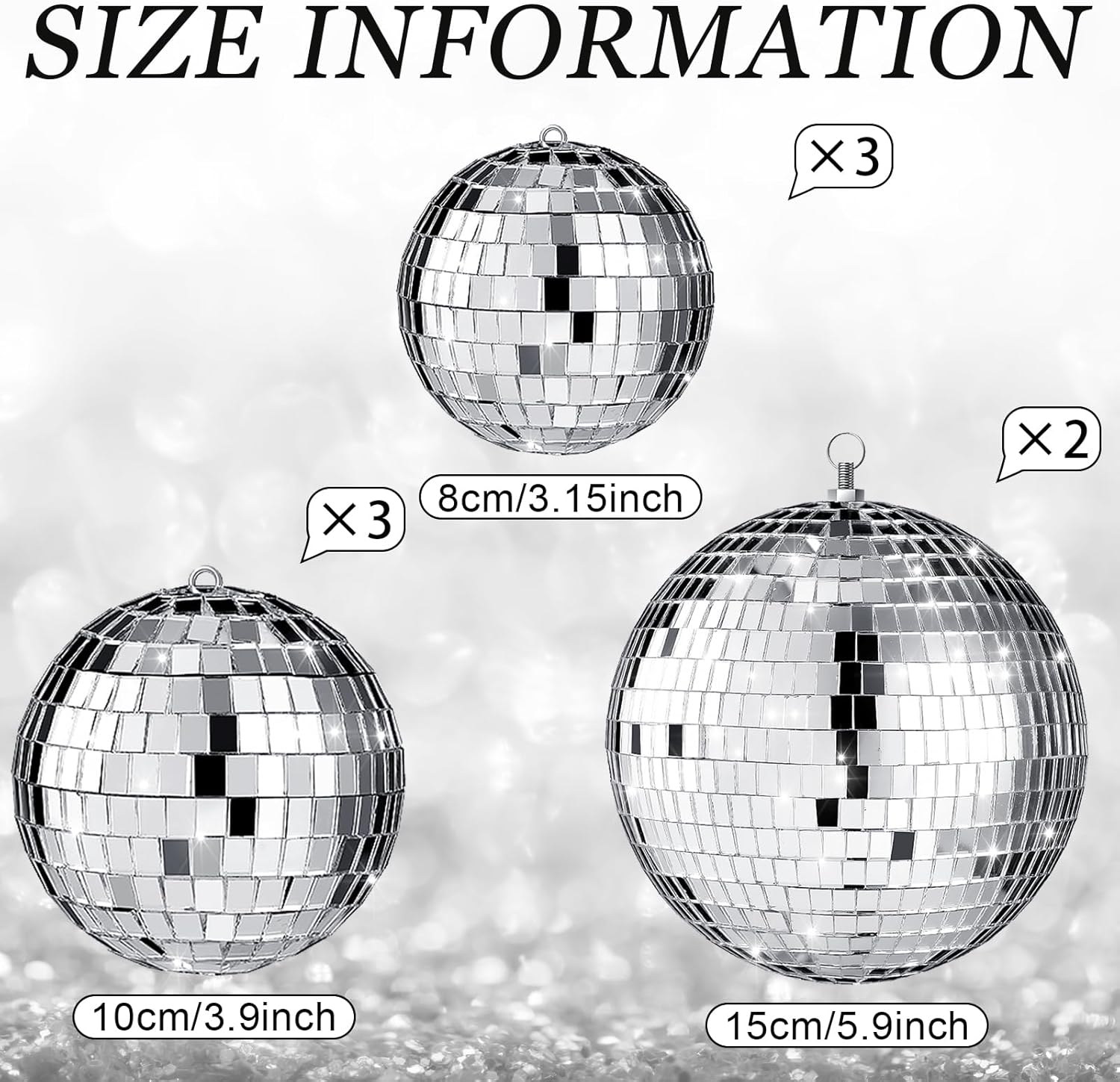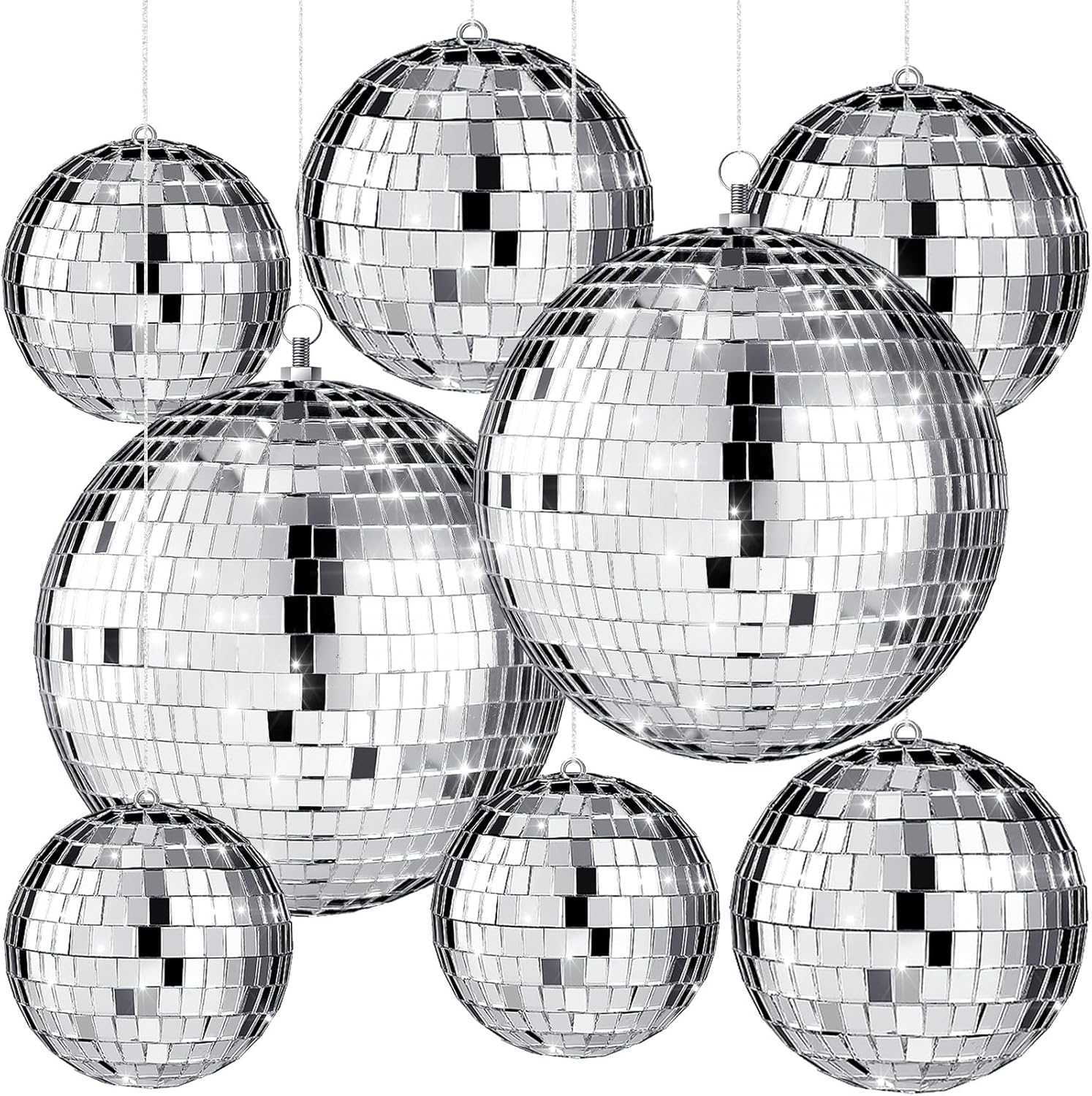 • Disco Ball Set: you will receive 8 pieces of disco balls with hanging rings in 3 sizes, respectively 1 piece of 8 inches large disco ball, 3 pieces of 6 inches middle disco balls and 4 pieces of 4 inches small disco balls, you can use them in combination or individually