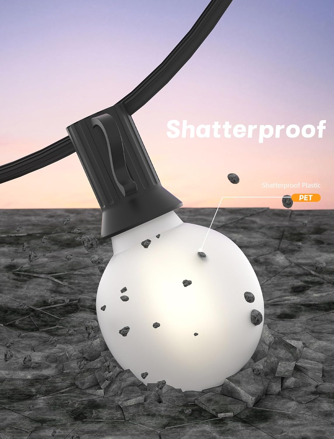 • Waterproof String Lights: With a fully sealed and waterproof design E12 base, G40 globe string lights can withstand rainy, windy, or damp climates, making sure that it is durable for long term use
