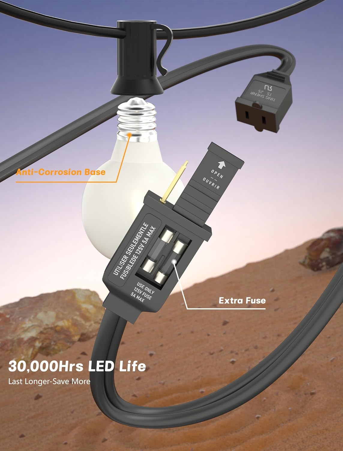 • Plug in & Instant on: LED Hanging lights are dimmable, but dimmers are not included.G40 LED frosted white string light is Plug in-Corded Electric string lights,electric plug in led string lights either with a built in spare fuse(125V/5A) for easy replacement