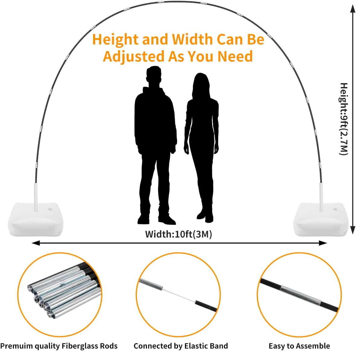 • Adjustable Size & Easy to Assemble: With inflated balloons prepared, you could set the arch within 10 minutes.You can adjust the height and width of the bow by adjusting the distance between the bases. You can also use the ground secure ropes and ground nails to fix as required