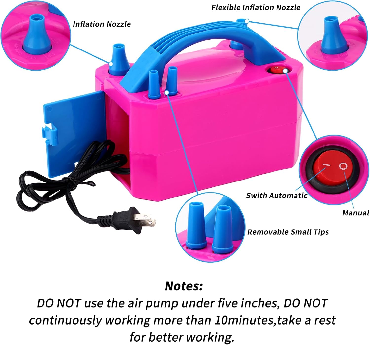 • Notes: Do not use the air pump under five inches balloons,we recommend take a rest every 10 minutes of use for better working