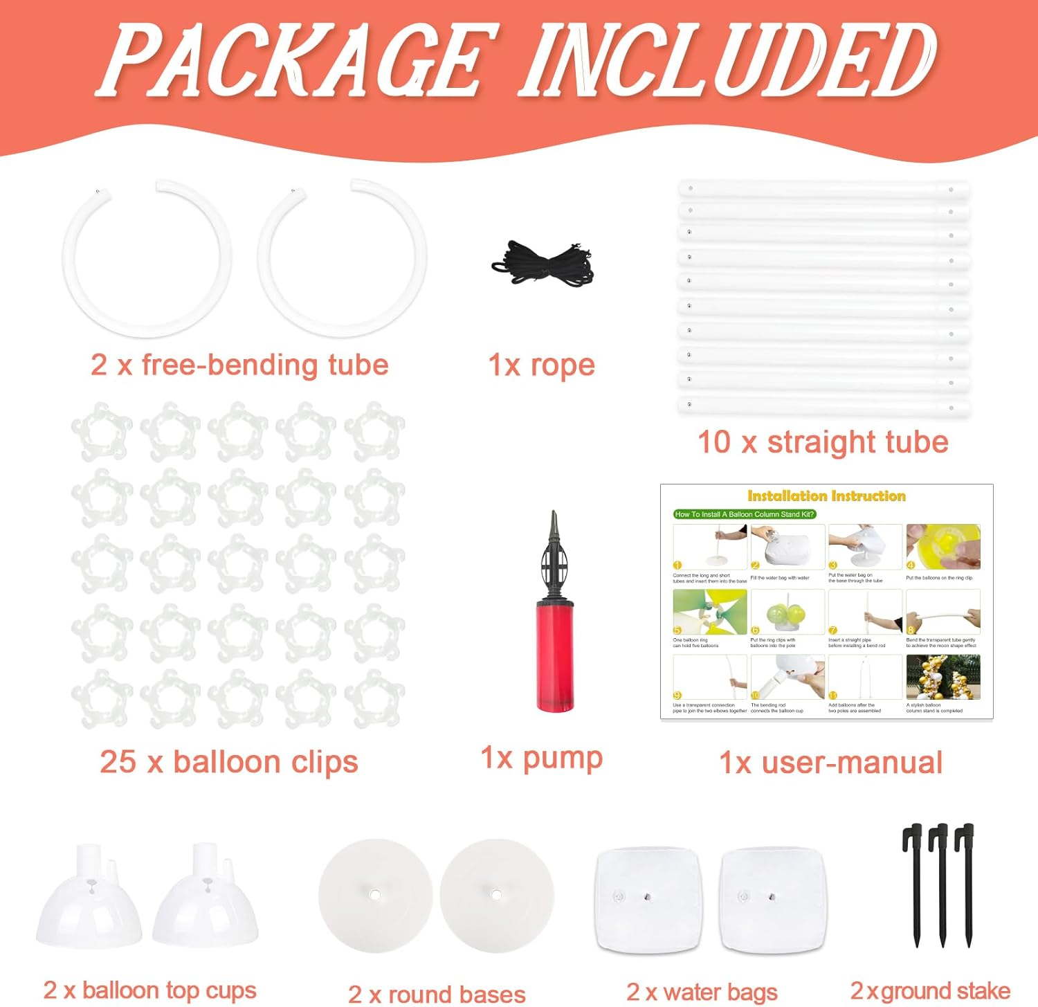 • Complete Package: Includes curved top arch stand, water fillable bags, heavy-duty PVC bases, connectors, and balloon ring clips.