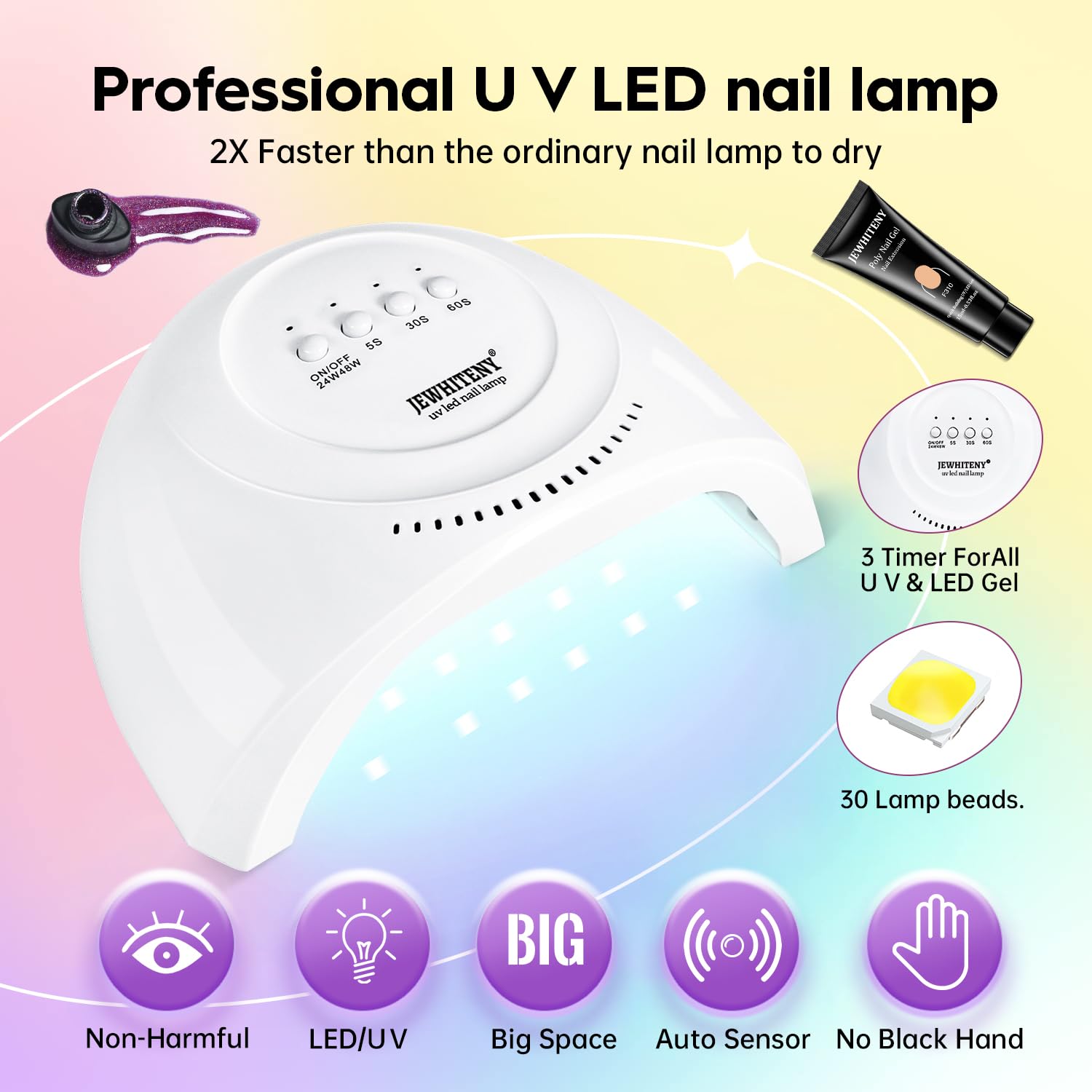 • [JEWHITENY POLY GEL&GEL Nail Polish NAIL KIT ]:1* 48W Nail lamp,14*15ml Poly nail gel, 27*5ml Gel nail polish,1*Base coat,1*Top coat,1*Matte top coat,1*30ml Poly gel slip solution,other basic nail art tools.
