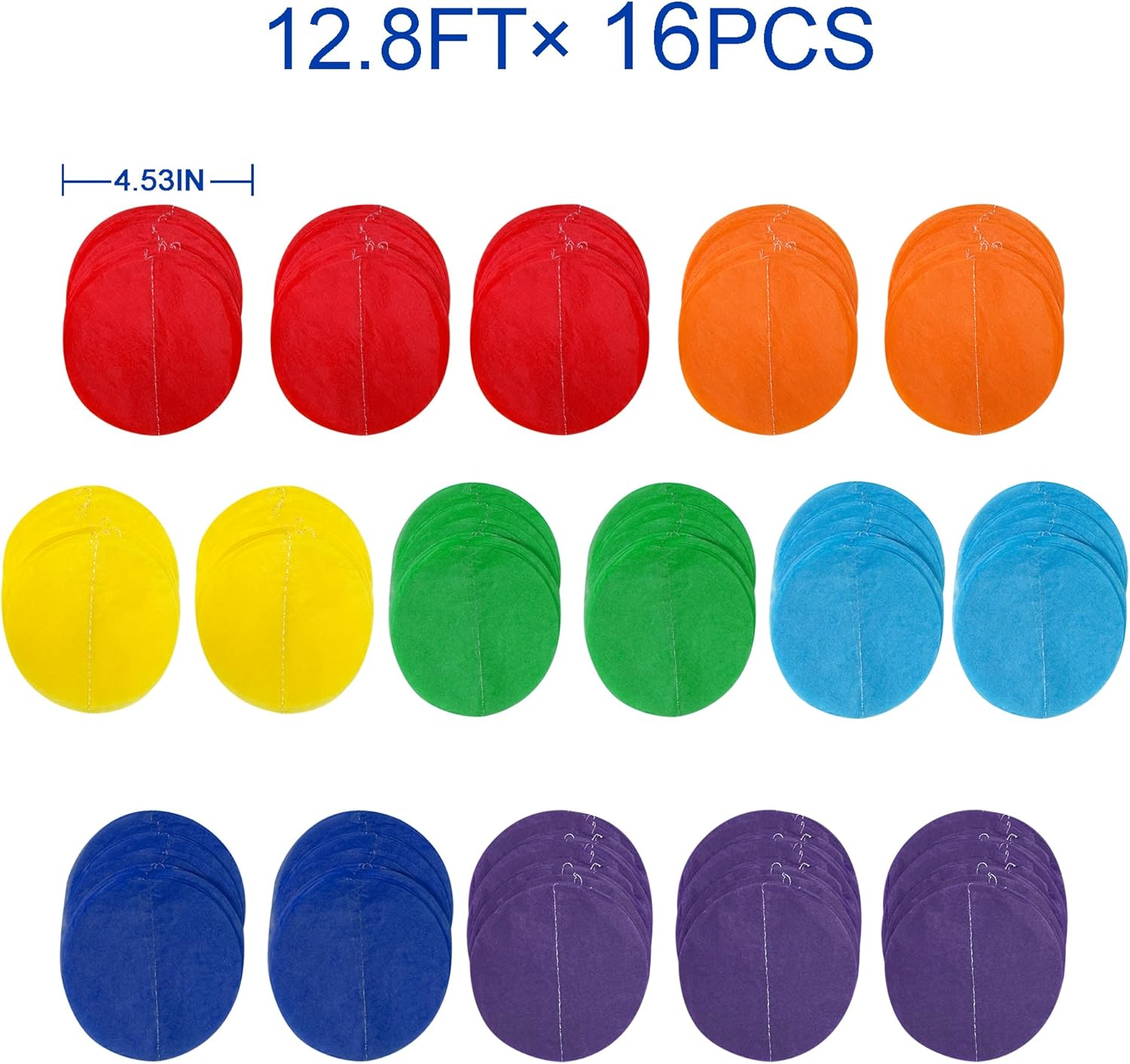 • đź”´PACKAGE CONTAINS- 16 packs of rainbow circle dot party garland banner,Each string is 12.8 feet/3.9 meters with 30 pcs polka dots, Total is 62.4 meters/205 feet.