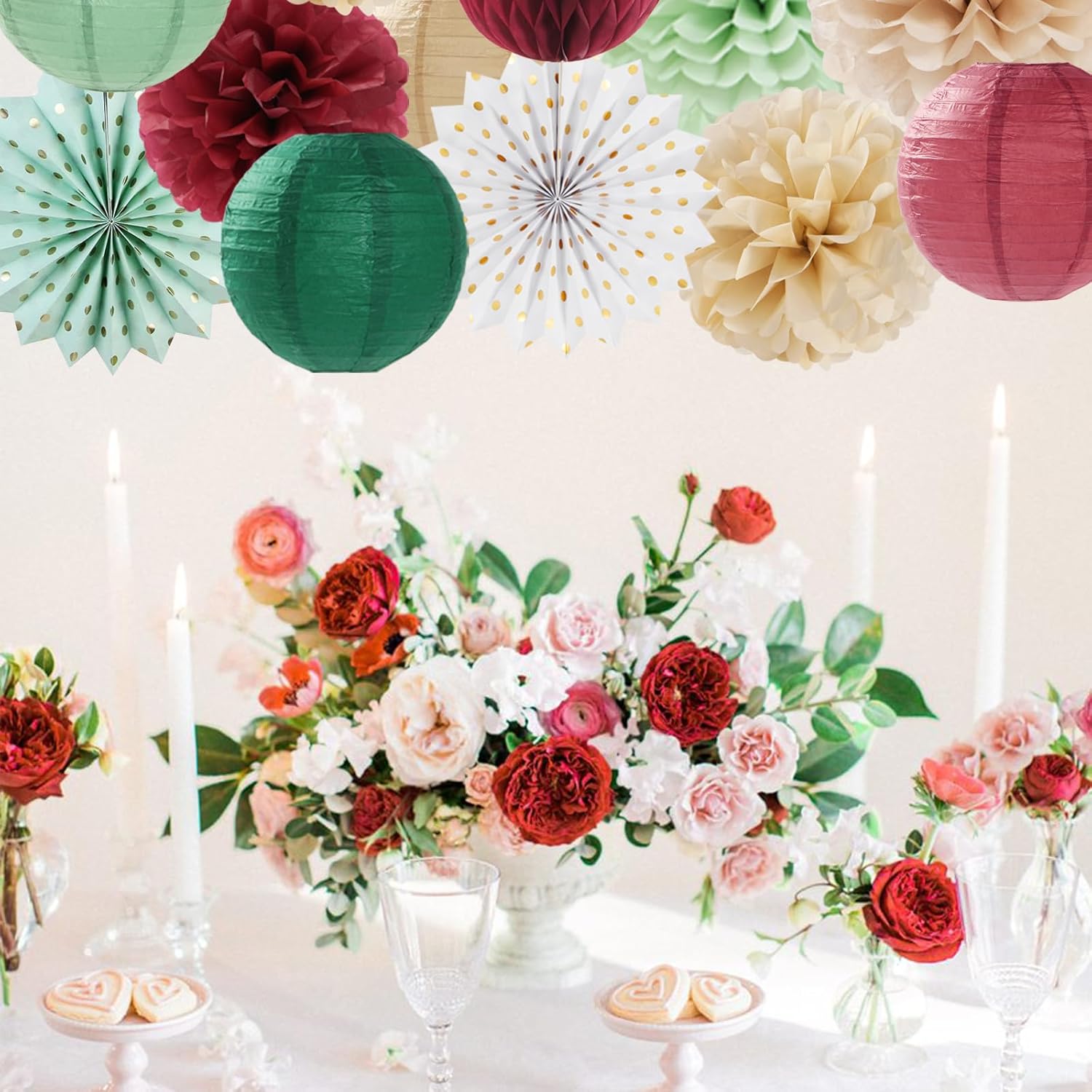 Sage-Olive Green Burgundy Champagne-Gold Party-Decorations - 14pcs Birthday Boho Paper Lanterns Fan Streamers,Tissue Pom Poms, Christmas Baby Bridal Shower Wedding Engagement Decor Lasting Surprise