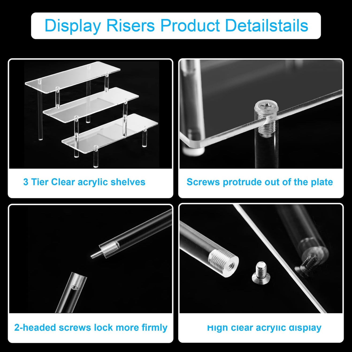 • What You Get: Acrylic stand riser include 2 X 3-tier display stand, 1 X Phillips Screwdriver, 1 X Specification