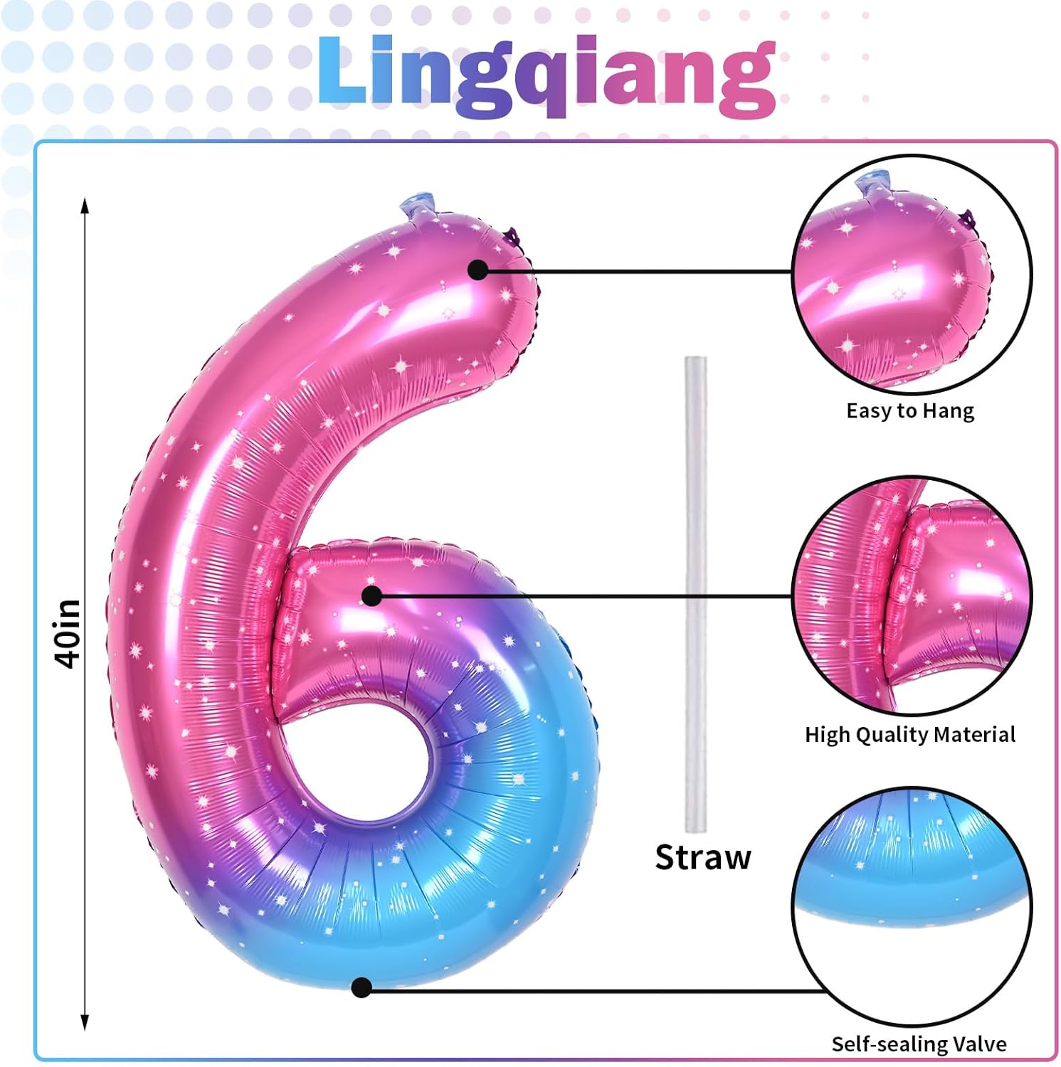 • πŸŽ‰ Gradient Rainbow Number 6 Balloon πŸŽ‰ - You will get 1pc 40 inch mylar foil pink blue starry number 6 balloon and 1pc straw. Perfect for 6th 16th 26th 60th 65th birthday or anniversary party decorations supplies.