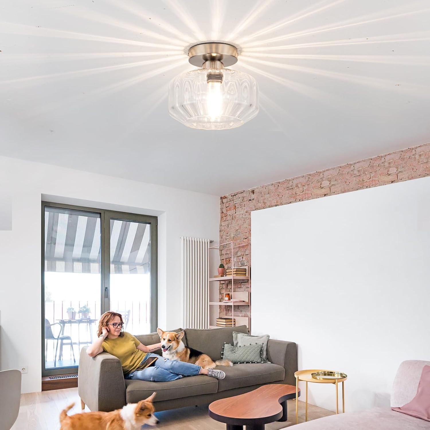 • 1.Semi-Flush Mount Design with Textured Glass & Brushed Nickel: Features a stylish semi flush mount ceiling light silhouette and durable brushed nickel base. The hand-blown clear textured glass shade creates stunning light diffusion and adds modern elegance, perfect for enhancing room decor. A classic yet modern flush mount ceiling light.