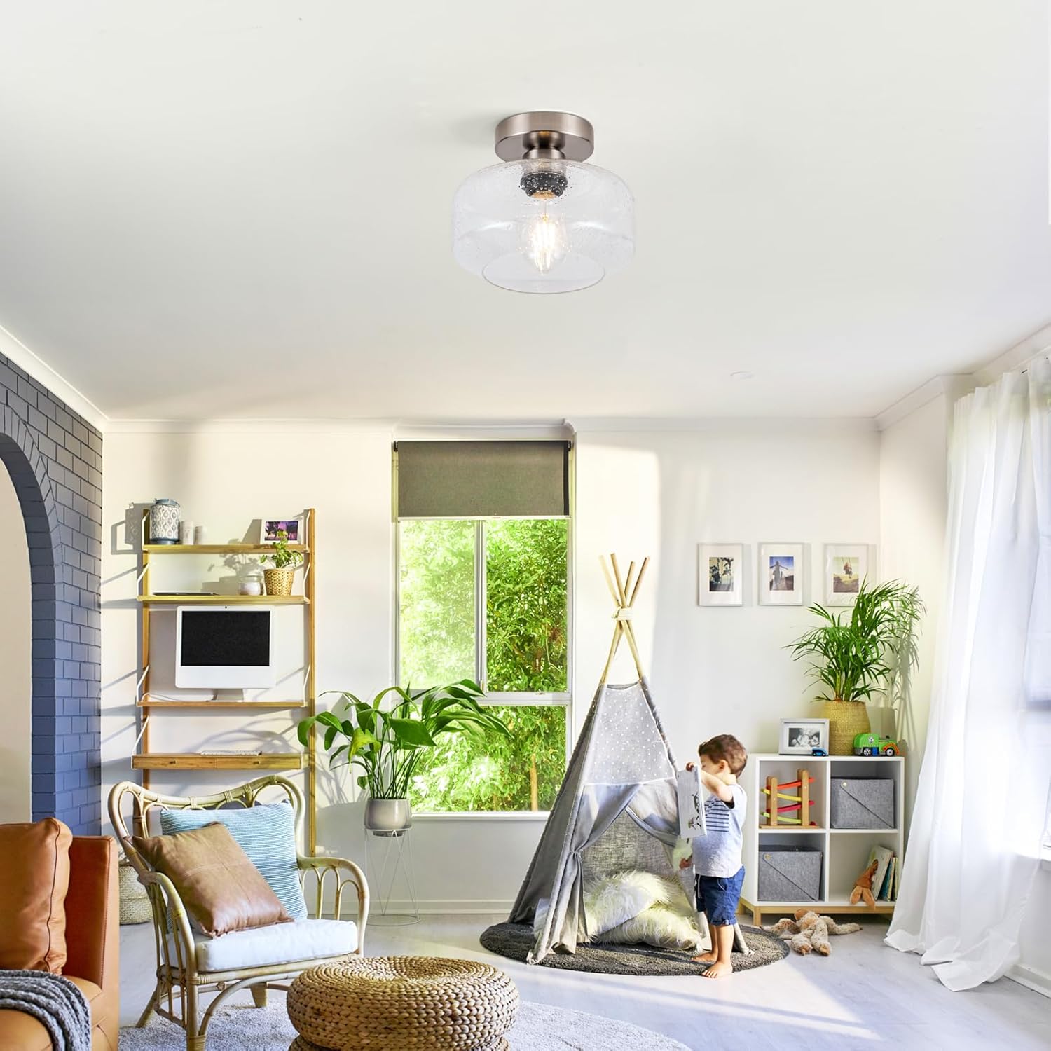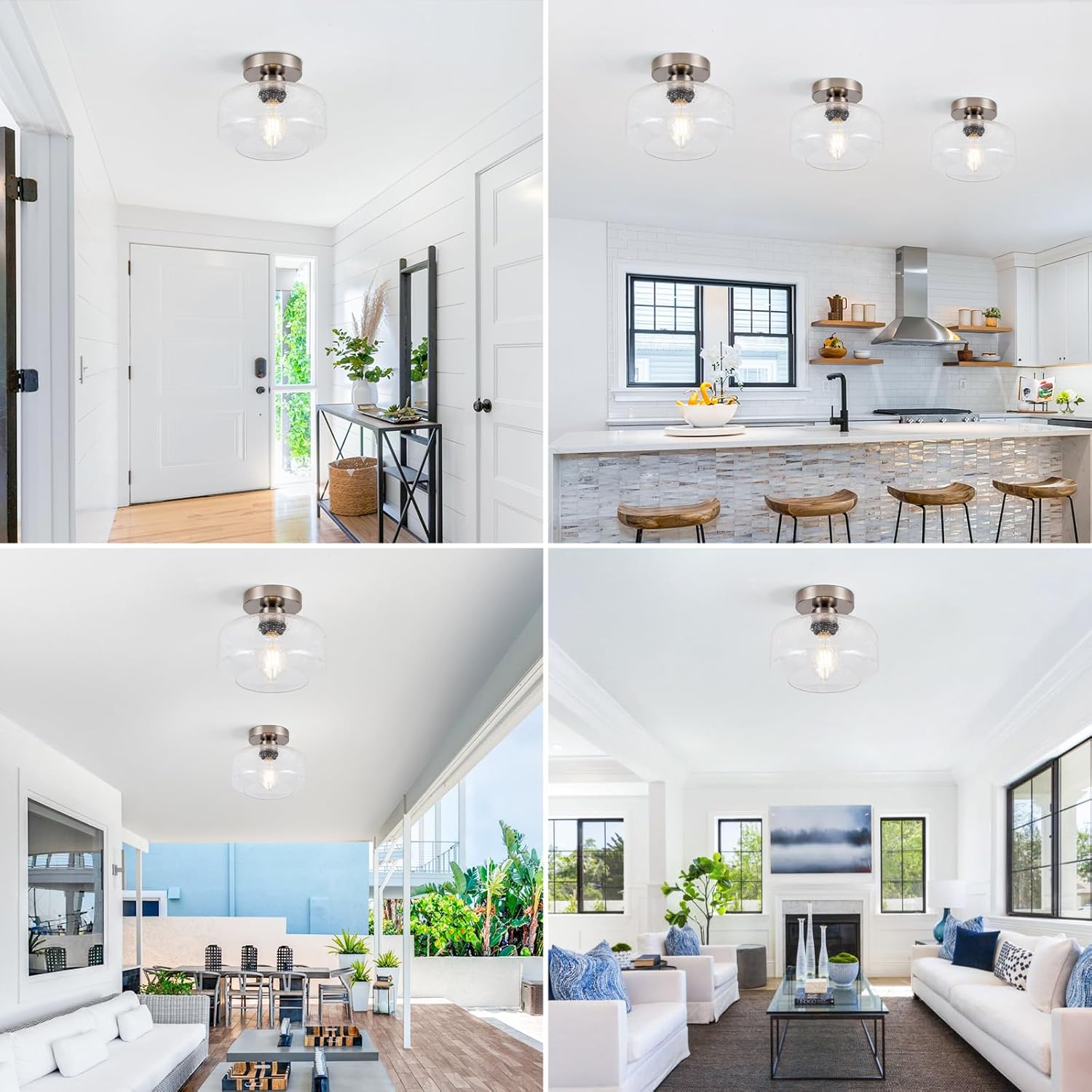 • 1.[ Vintage Style Semi-Flush Mount & Clear Seeded Glass: ] This elegant ceiling light fixture combines a vintage-inspired design with hand-blown clear seeded glass. The brushed nickel metal base offers durable, rust-resistant beauty. The seeded glass creates stunning, ambient shadows on your ceiling, elevating your decor.