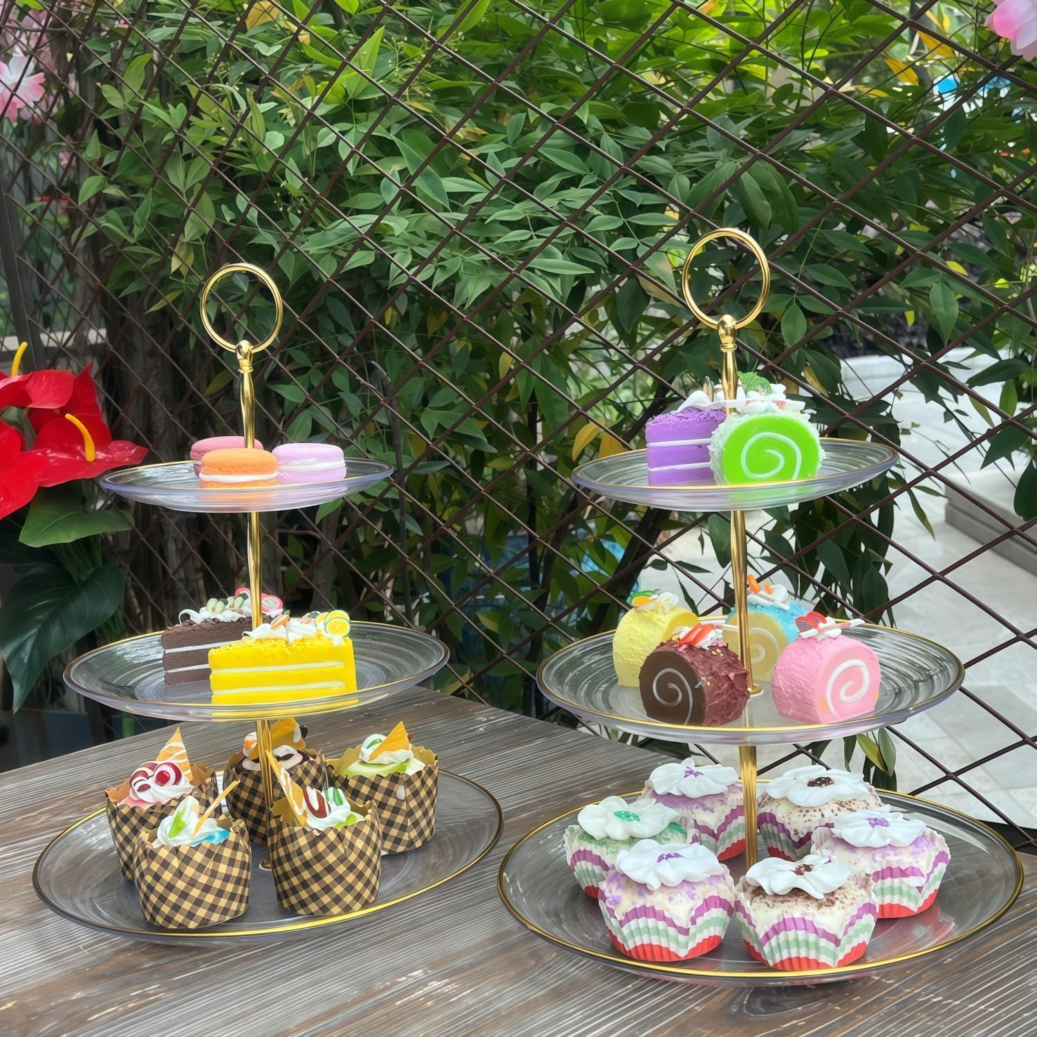 • Exquisite workmanship: clear plastic relief design cake stand with a delicate sturdy gold stents, can show your carefully prepared dessert snacks and cakes, also an attractive ornament on the table
