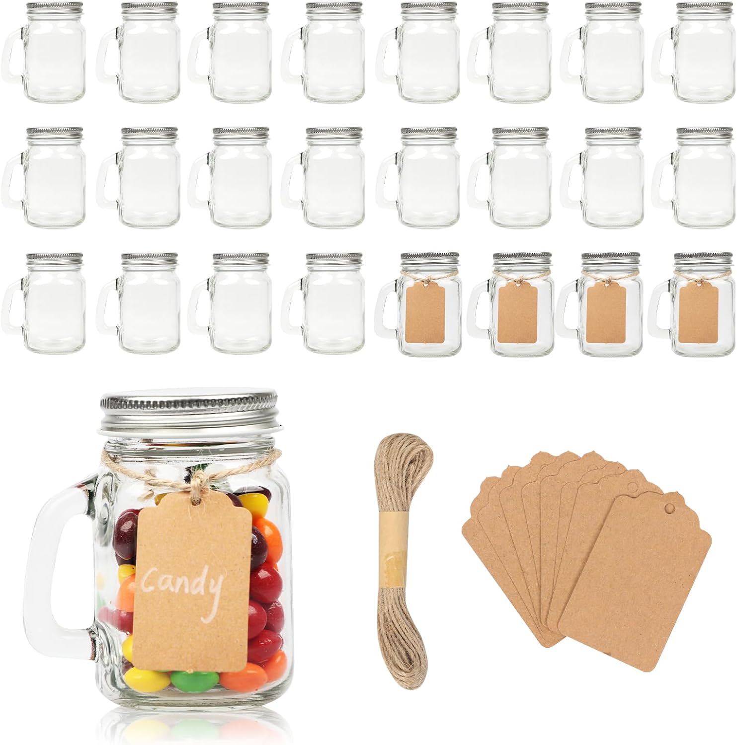 4 oz Small Mason Jar Mugs with Handle, 24 Pack Mini Glass Jars with Airtight Metal Lids, Empty Glass Mugs with Kraft Paper Gift Tag for Party Wedding Favor