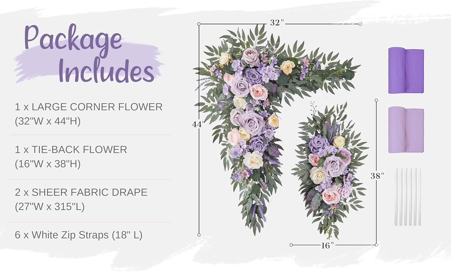 • PAKEAGE LIST: 1 x Large Corner Flower Swag of 32 "W x 44 "H + 1 x Large Tie-Back Flower of 16 "W x 38 "H + 2 x Hanging Sheer Drapes of 315 x 28 inch + 6 x White Zip Straps of 17.7 inch + 1 x Instruction Card + 1 x Glue Stick (Not include wood arch stand)