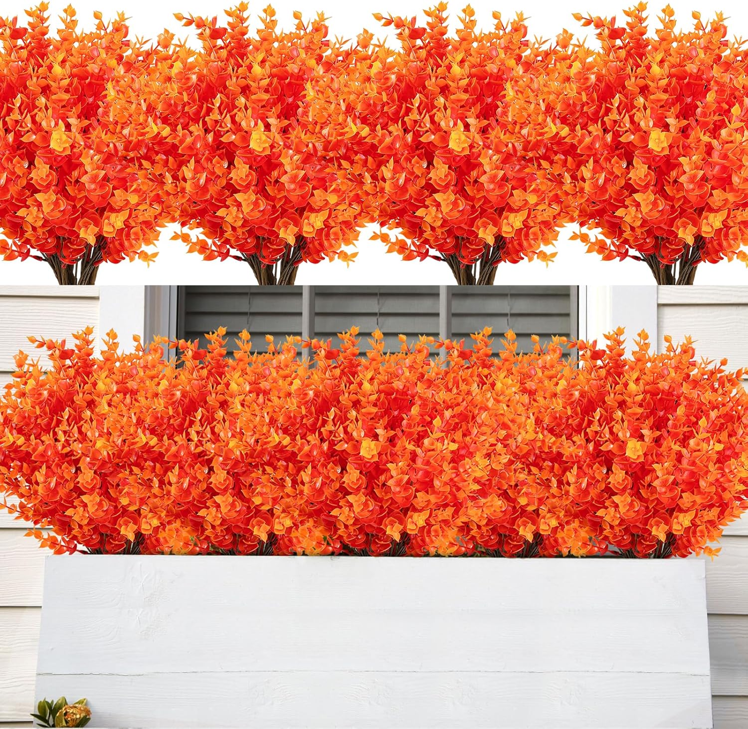 AmyHomie 20 Bundles Orange Fall Decor Artificial Flowers for Outdoor UV Resistant Faux Eucalyptus No Fade Fake Mums Plastic Plants Garden Porch Window Box Decorating