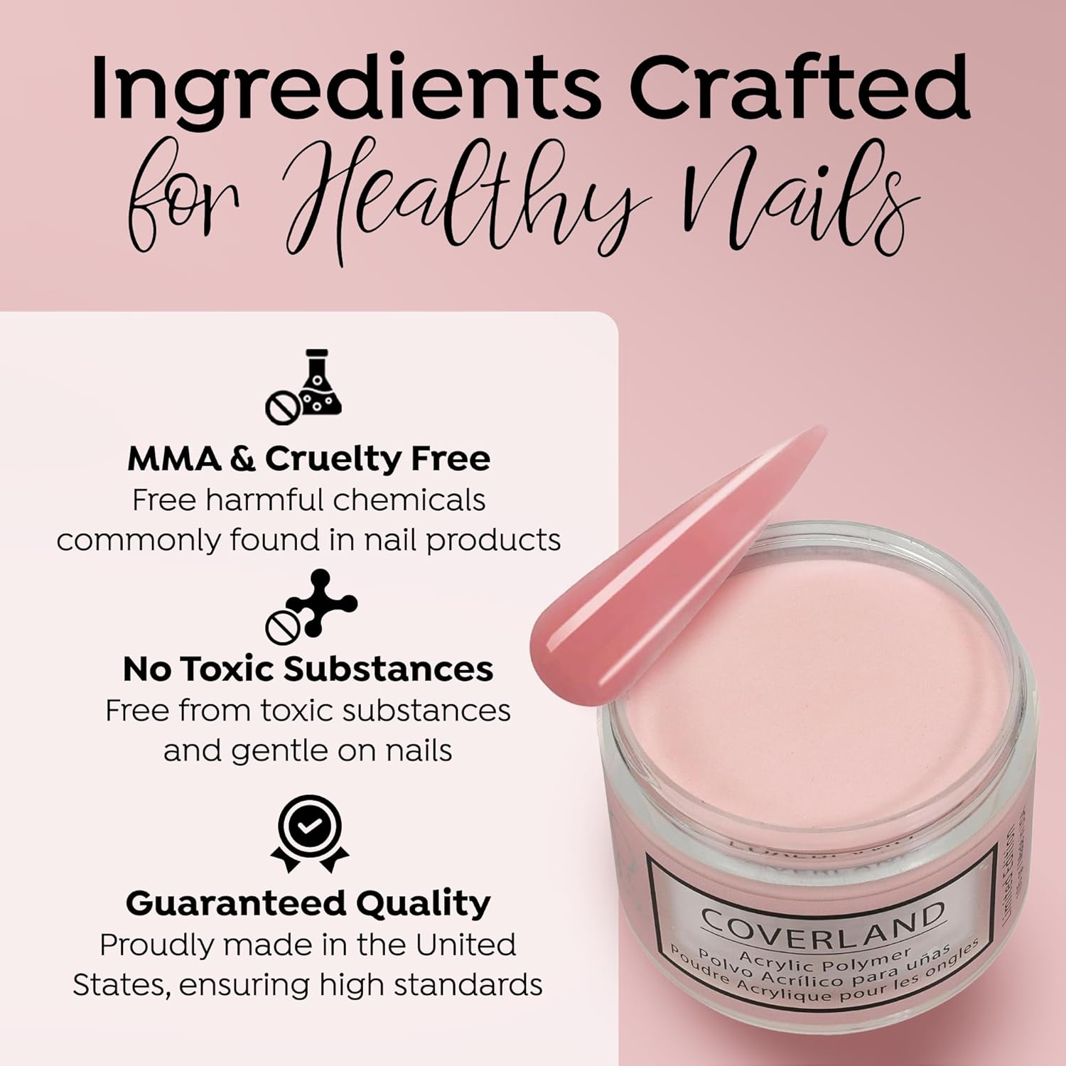 • βœ”οΈππ‘πŽπ…π„π’π’πˆπŽππ€π‹ 𝐆𝐑𝐀𝐃𝐄: The flexibility and adhesion properties of Coverland colored acrylic nail powder make it easy to shape nails with precision, and offers nice control for professionals who prefer to work with a polymerization rate of moderate to fast.