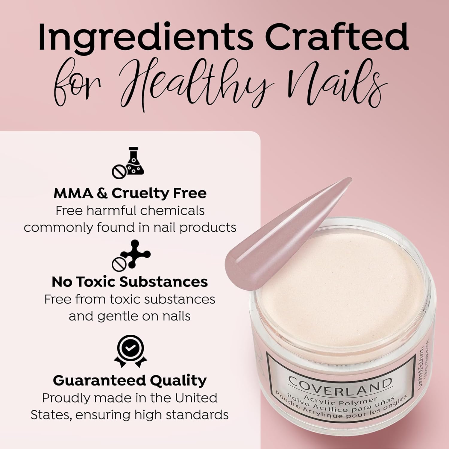 • βœ”οΈππ‘πŽπ…π„π’π’πˆπŽππ€π‹ 𝐆𝐑𝐀𝐃𝐄: The flexibility and adhesion properties of Coverland colored acrylic nail powder make it easy to shape nails with precision, and offers nice control for professionals who prefer to work with a polymerization rate of moderate to fast.