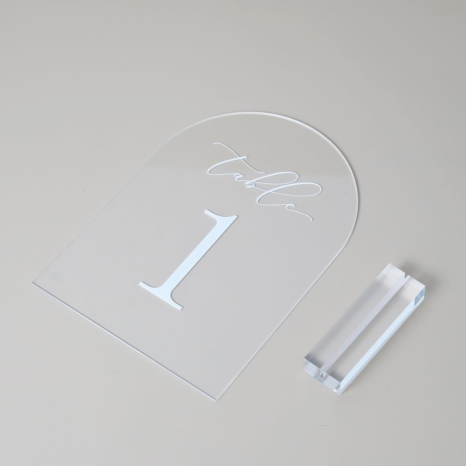 • Clear Arch Table Numbers with Acrylic Stands: Arched acrylic is so on trend for this year's wedding decorations. These gorgeous arch acrylic wedding table numbers will look stunning on your tables and go with any wedding style, from rustic through to timeless and classic.