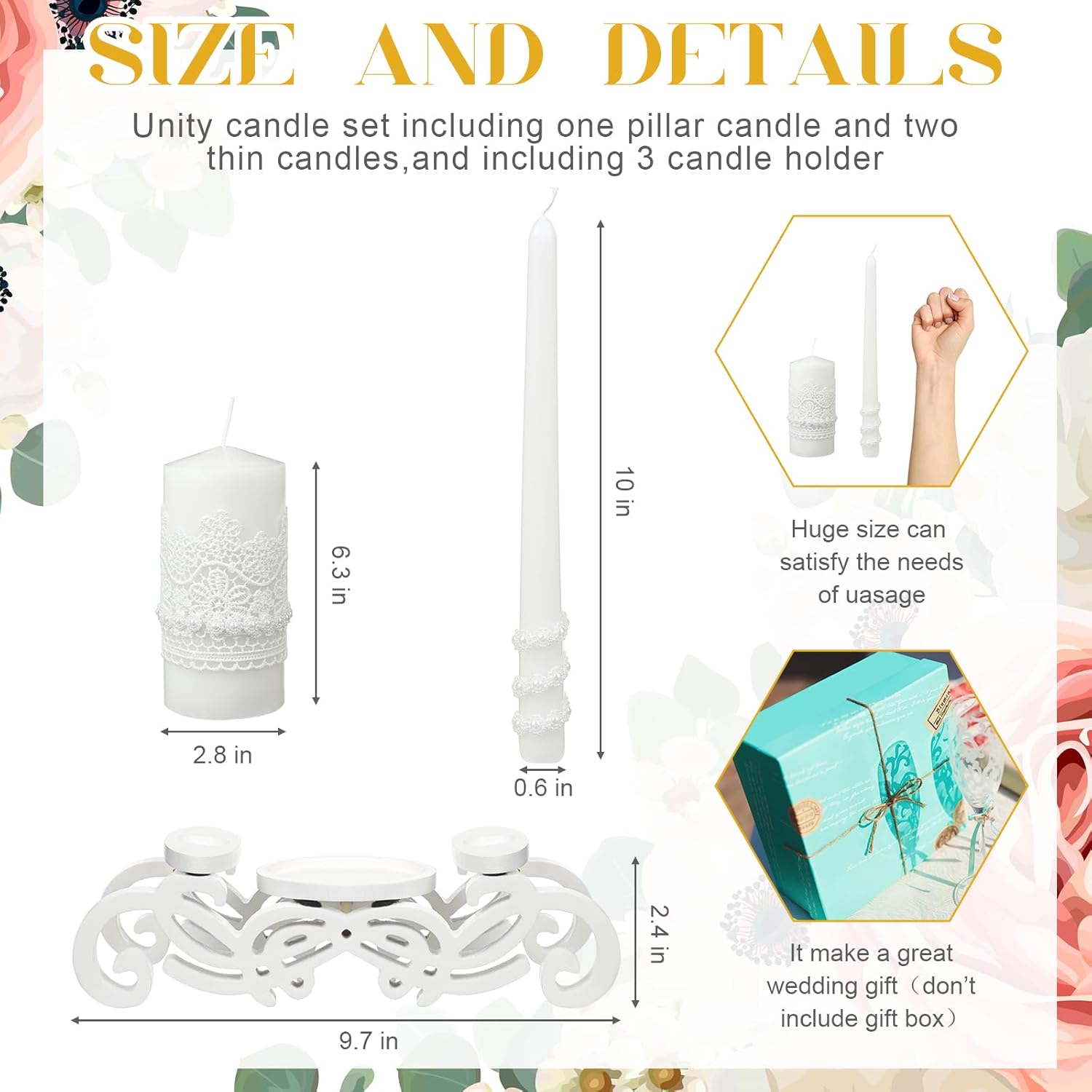 • Nice Gifts: the unity candles and holders are practical and decorative, will be an exquisite gift for your friends, family members, girlfriend, colleagues and other people you love, suitable for weddings, anniversaries, birthday, home decor, dinner parties, festivals, formal events, weddings, to add luster to these occasions