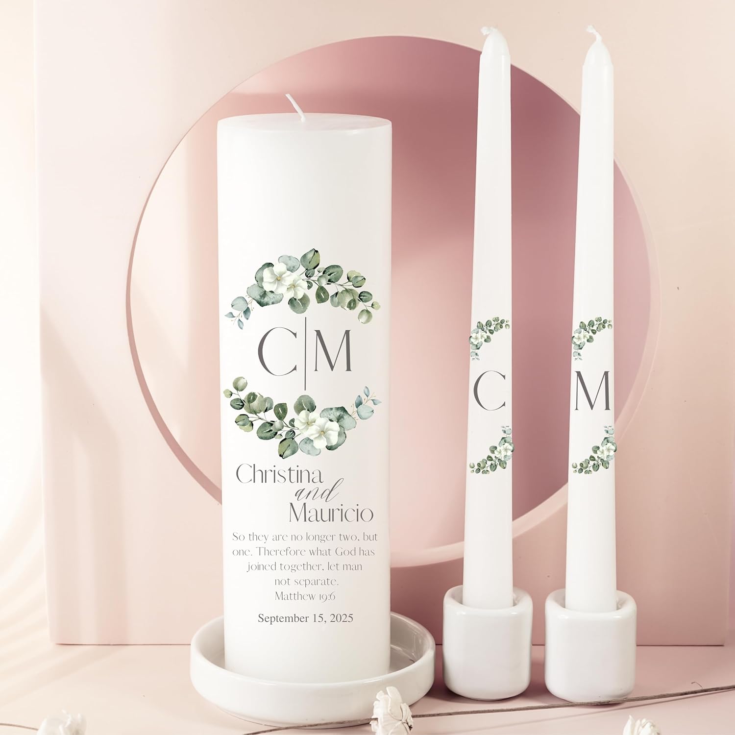 Unity Candles for Wedding, Modern Unity Set, Custom and Personalized Pillar and Taper Candles with Bible Quote, Unscented White Premium Wax, Religious and Wedding Ceremony, Special Events (Greenie)