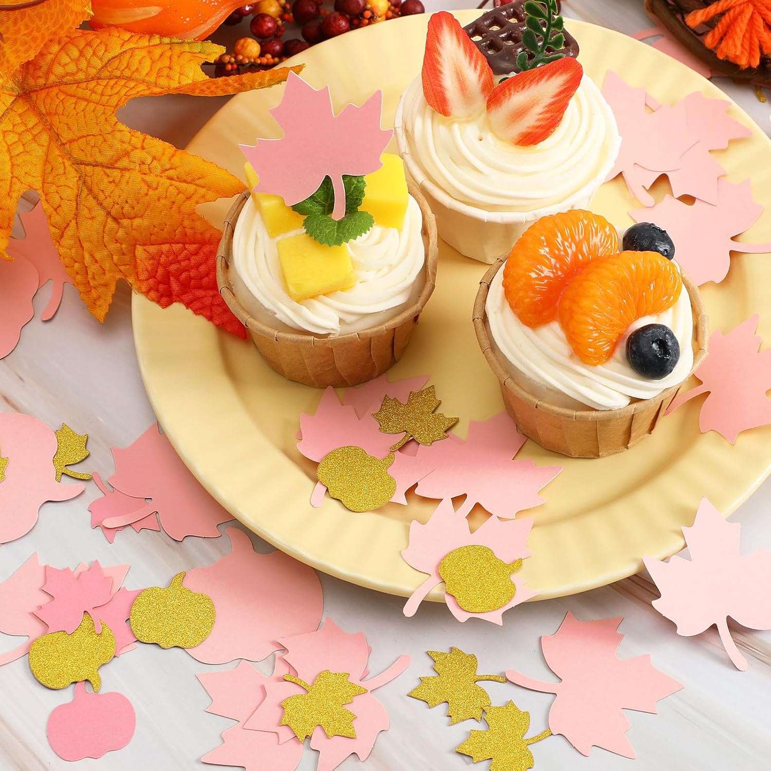 MARFOREVER 350 Pcs Fall Thanksgiving Pink and Gold Pumpkin Maple Leaf Confetti, Little Pumpkin Baby Shower Glitter Confetti Thanksgiving Table Decorations for Autumn Birthday Party Supplies