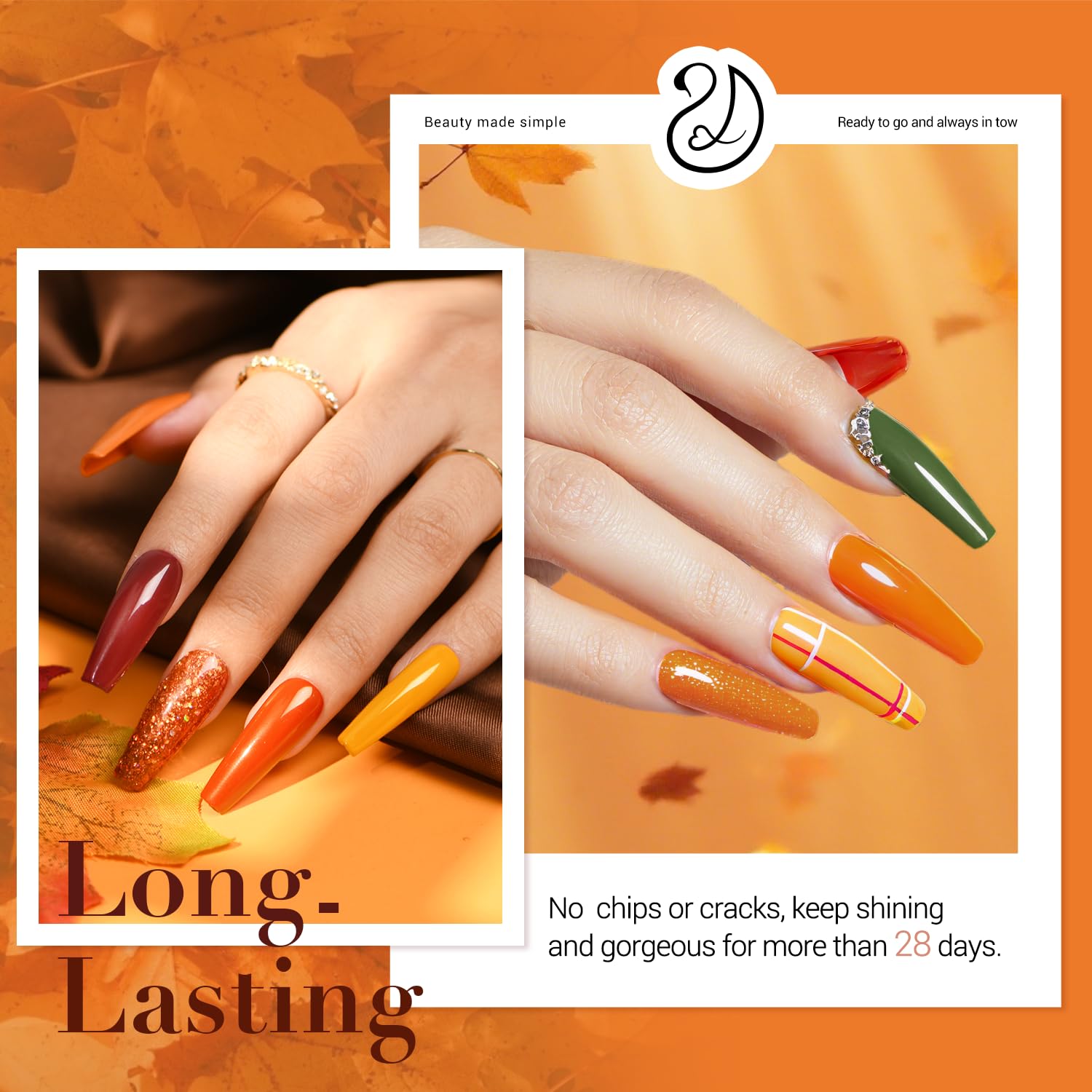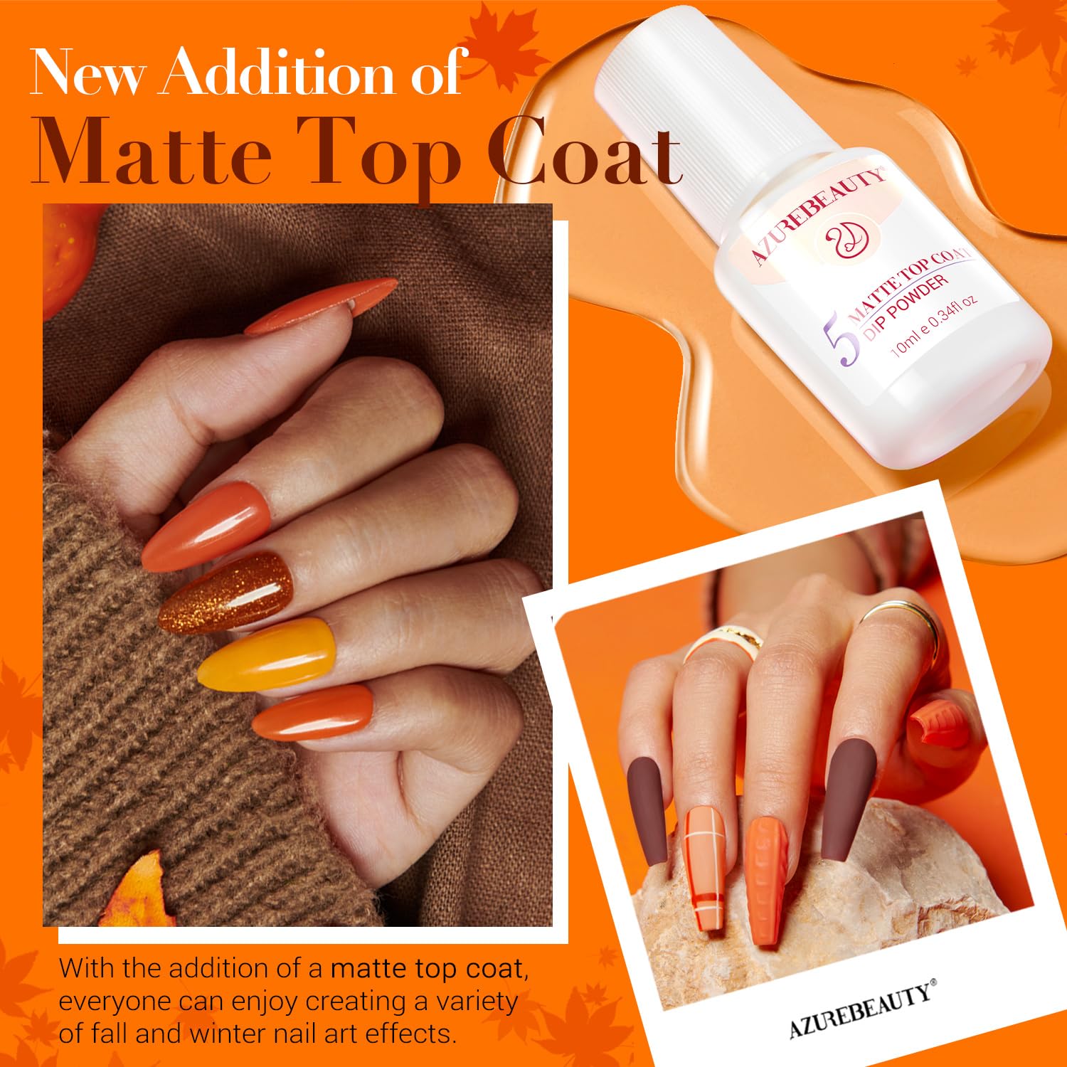 • 8-Color Upgraded Starter Kit: AZUREBEAUTY 30 Pcs fall theme dip nails powder starter kit: 8*10 g (0.33 Oz) color powder, 4*10 ml dip powder liquid set(base coat/activator/top coat/matte top coat), 2*liquid brush replacement, 1*nail brush,1*nail file, 1*nail buffer, 1*dip powder recycling tray. What's more, 10*nail sticks and 2*orangewood stickers are added in the kit for color testing as well as ease of use