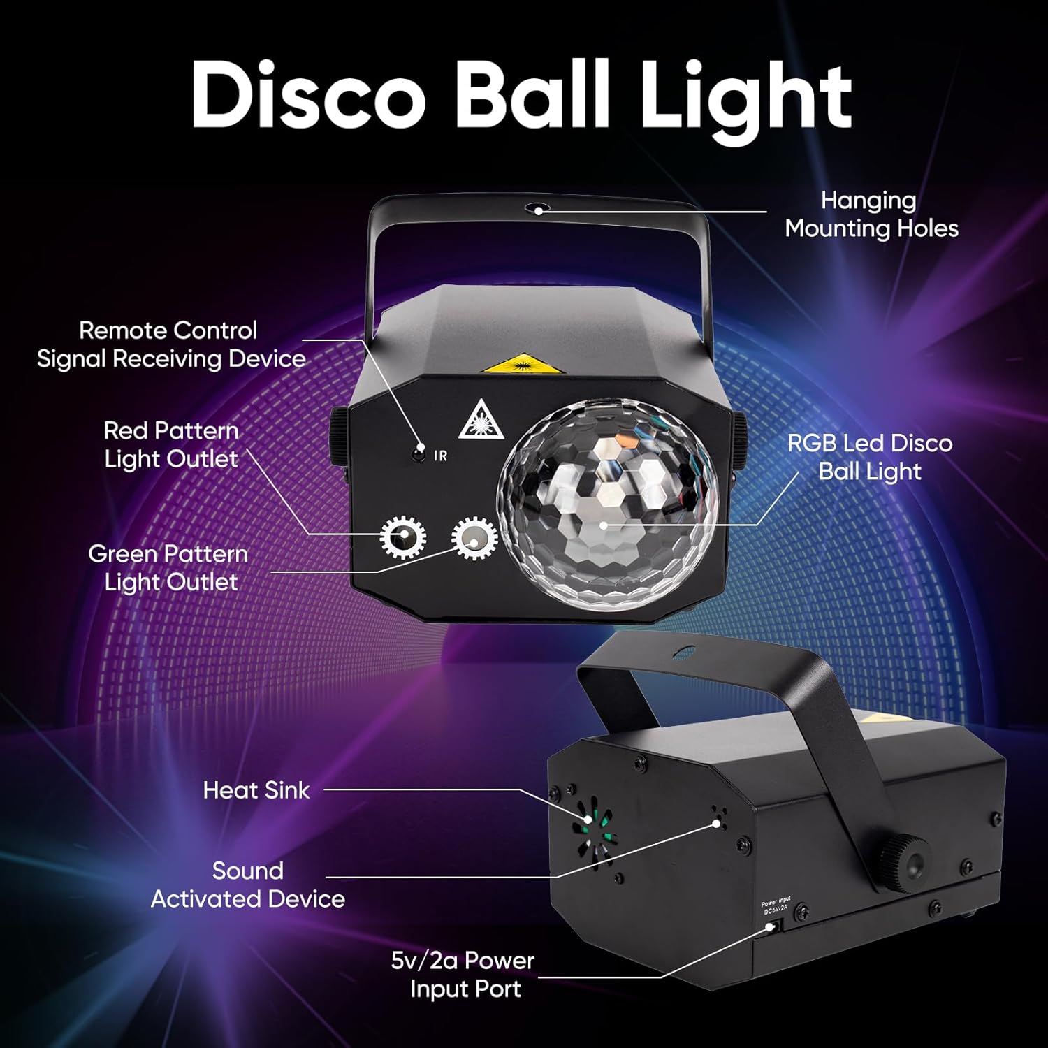 • Multi-Effects 2 in 1 Disco Ball Light: This upgraded disco ball light combines 72 party laser lights patterns with a vibrant disco square effect to create a stunning laser light show. It features red and green dj laser sources and RGB disco ball light, allowing you to switch between dj laser light, disco-only, or combined modes—perfect for party lights outdoor and disco lights for parties indoor