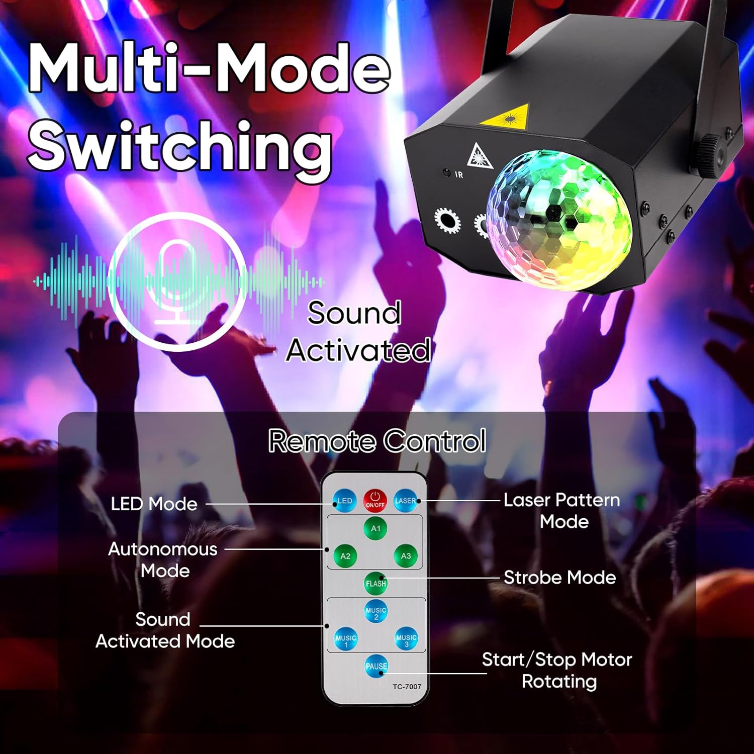 • Multi-Mode DJ Lights with Remote Control: Equipped with 5 working modes—strobe, auto, sound control, laser, and LED—this disco ball light is the ultimate party lights outdoor solution; Control your favorite laser party light setup from up to 50 feet away; Its responsive sound sensor syncs to your music, making it ideal for disco lights for parties and immersive stage laser lights experiences