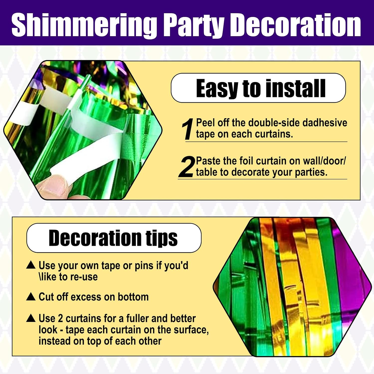 • Easy To Assemble | Strong Adhesive | Not Easy Fade : The foil fringe curtain backdrop party decorations come with double-sided adhesive tape, easy to use, just tear off the back of adhesive tape, then paste this streamers backdrop curtains on the top of wall, window, table, or as door fringe decoration.