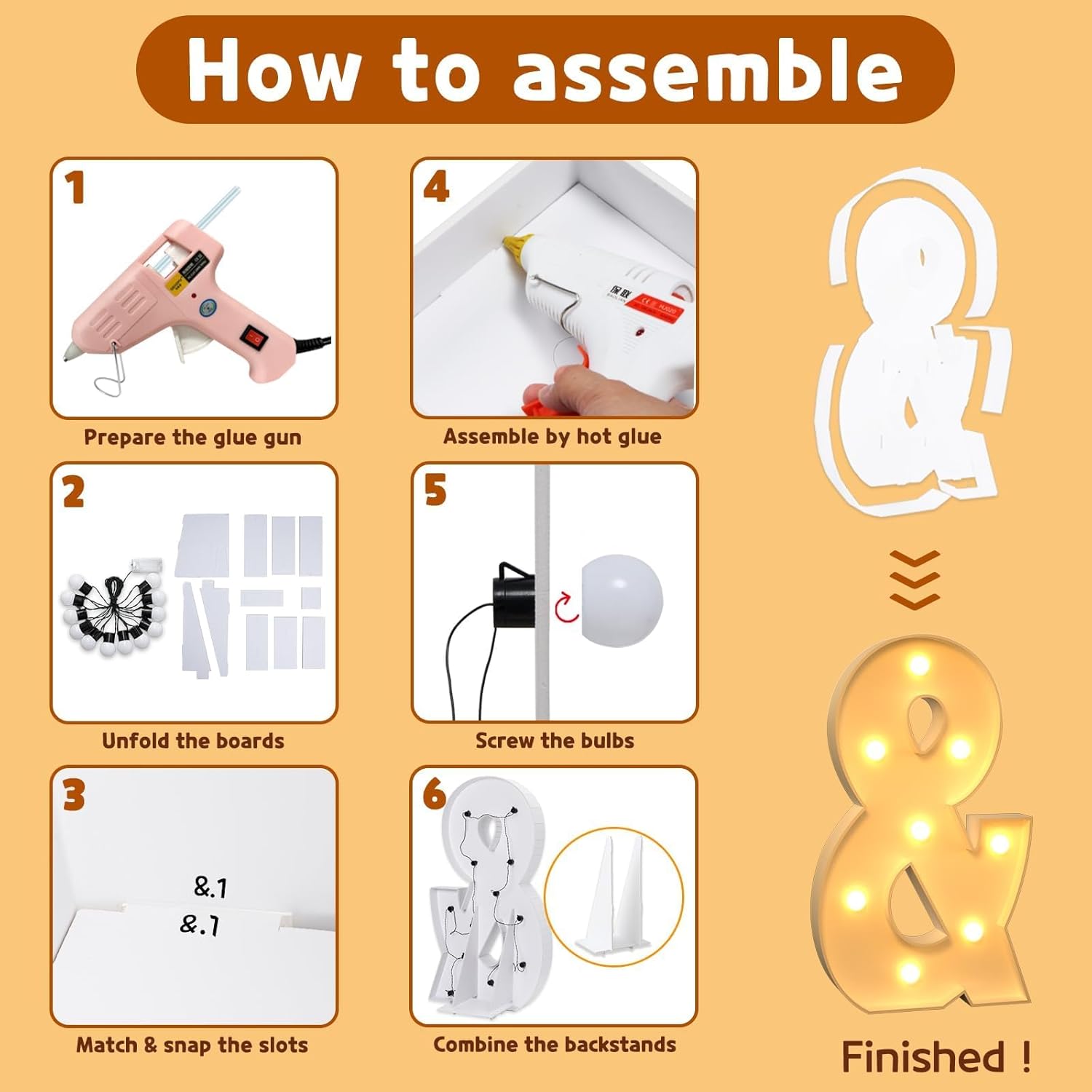 • Need to Assemble: 3 ft marquee letters are pre-cut frame with slots, 1) Match the slots on the board and put all boards together by hot glue; 2) Screw the bulbs on the board and install 3 AA batteries