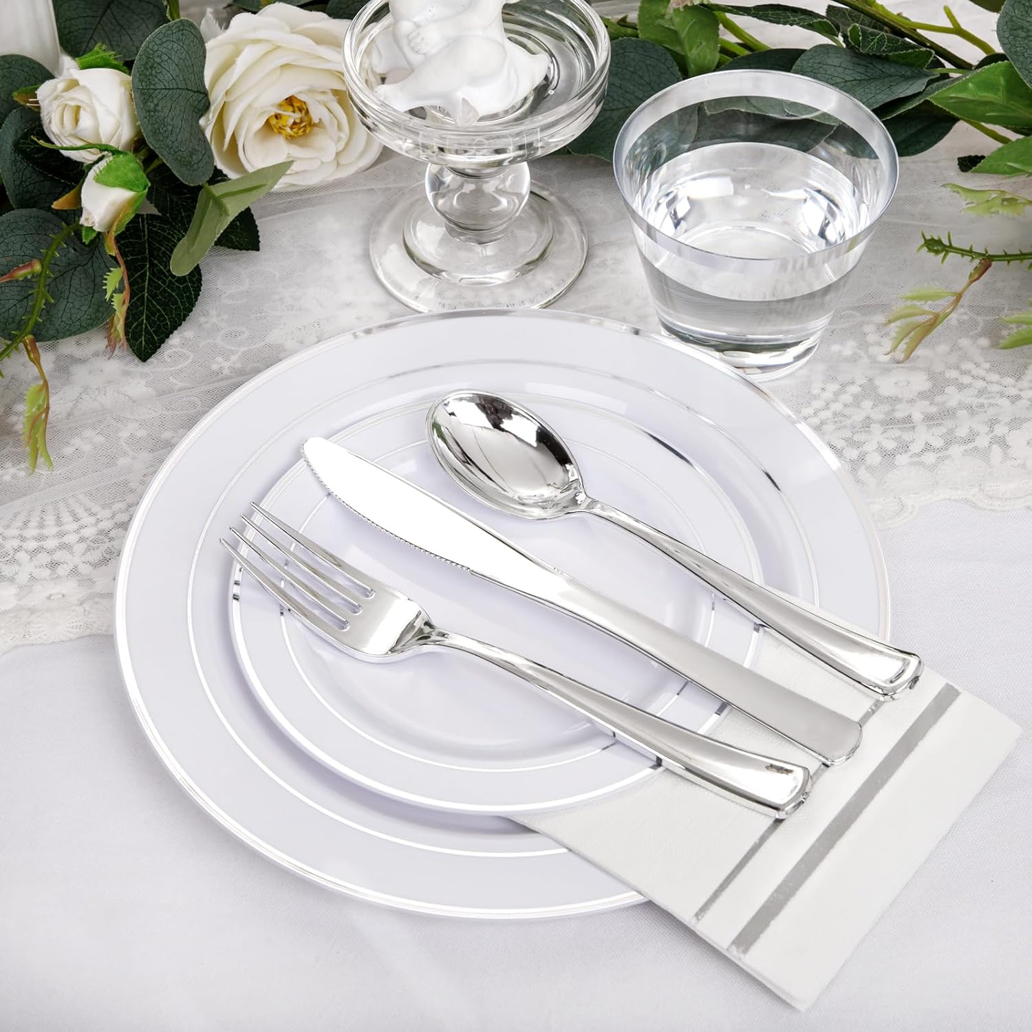 NOCCUR 700PCS Silver Plastic Plates Disposable for 100 Guests - Include 100 Dinner/Dessert White Plastic Plates with Silver Trim,300 Cutlery,100 Cups,100 Napkins for Party&Christmas
