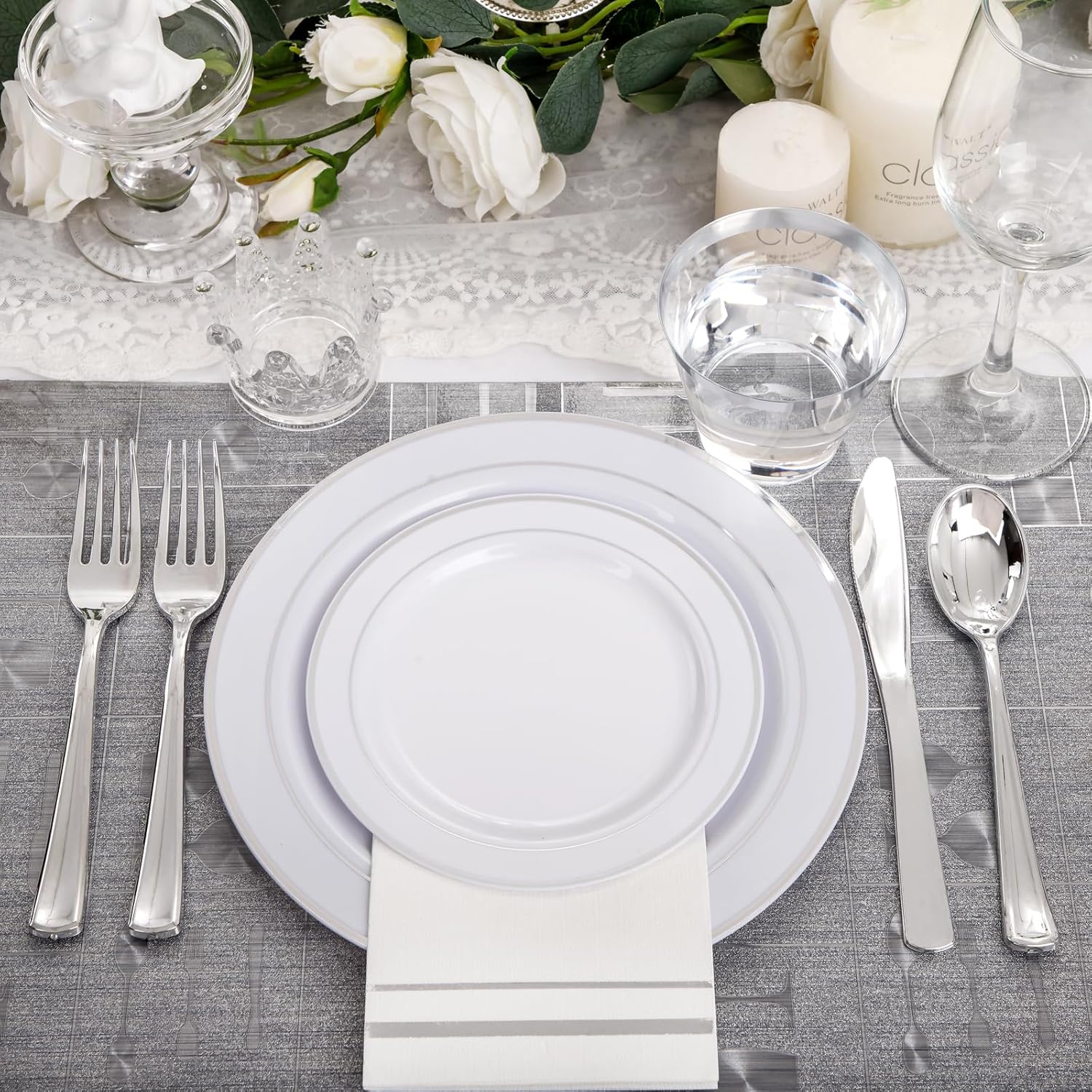 • ELEGANT AND EXQUISITE DESIGN:Our premium silver disposable plates have a unique and exquisite design. The edges of these white plastic plates with silver trim are twice silver plated, elegant and delicate. And these shiny silver plastic cutlery make the party even more glamorous.
